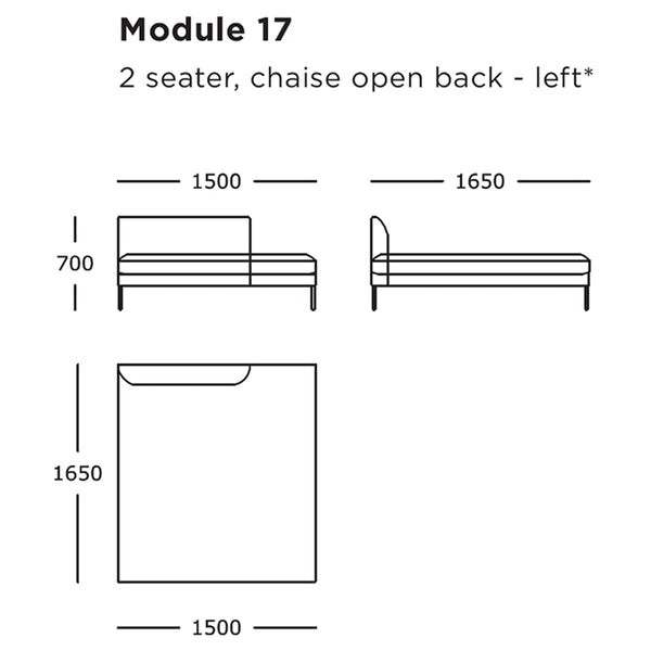 Module 17 (2 Seater, Chaise Open Back, Left): 59.1" W x 65" D x 27.6" H | 16.5" SH