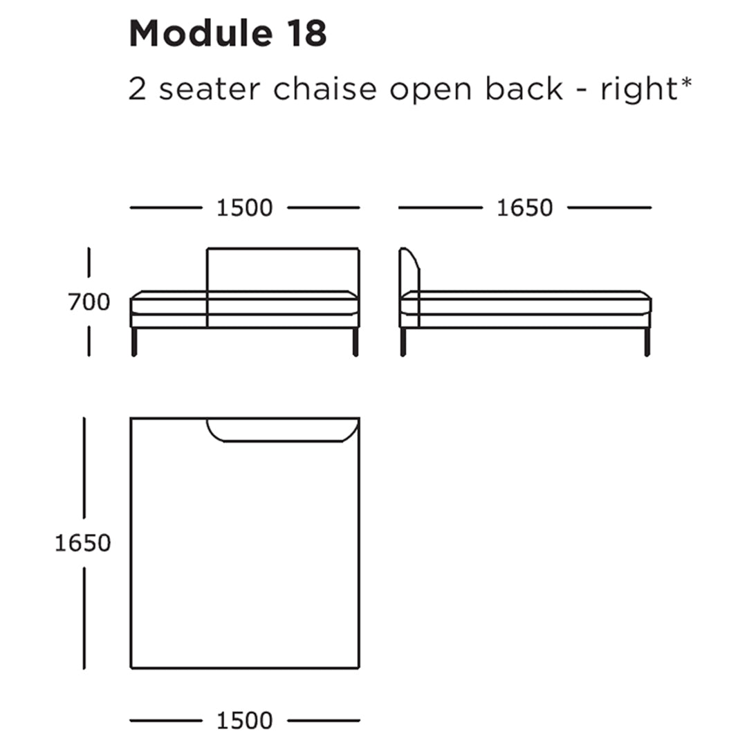 Module 18 (2 Seater, Chaise Open Back, Right): 59.1" W x 65" D x 27.6" H | 16.5" SH
