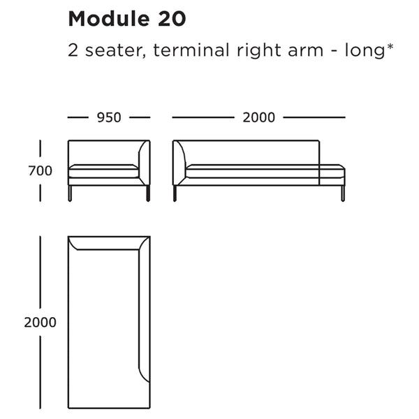 Module 20 (2 Seater, Long, Terminal Right): 37.4" W x 78.7" D x 27.6" H | 16.5" SH