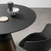 Choose between two harmonious circular dimensions—47.2" or 59.1" diameter—each offering generous space for gathering while maintaining the table's elegant proportions. The tabletop is available in three premium finishes: sleek black laminate, richly textured black stained oak veneer, or warm brown stained oak veneer, each selected to complement its corresponding base finish.