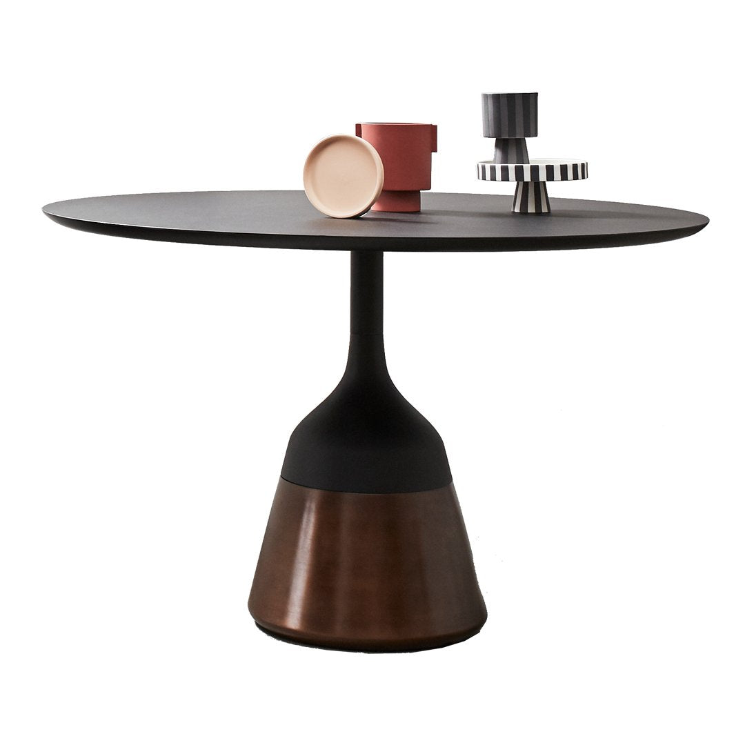 The table's defining feature is its distinctive cast aluminum base—an amplified silhouette of the collection's side tables—that provides exceptional stability through its precise conical form. Available in sophisticated finish options including black with burnished brass, solid black powder-coating, or dark brown powder-coating, the base creates a captivating visual foundation for the perfectly proportioned tabletop above.
