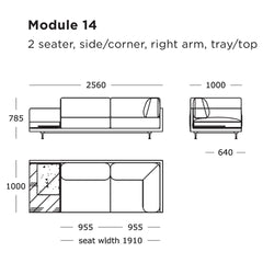 Module 14 (2 Seater, Side/Corner, Right Arm, Left Light Oak Tray/Marble Top): 100.8" W x 39.4" D x 30.9" H