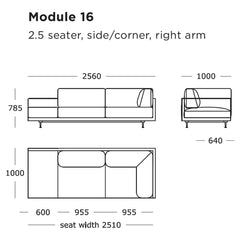 Module 16 (2.5 Seater, Side/Corner, Right Arm): 100.8" W x 39.4" D x 30.9" H