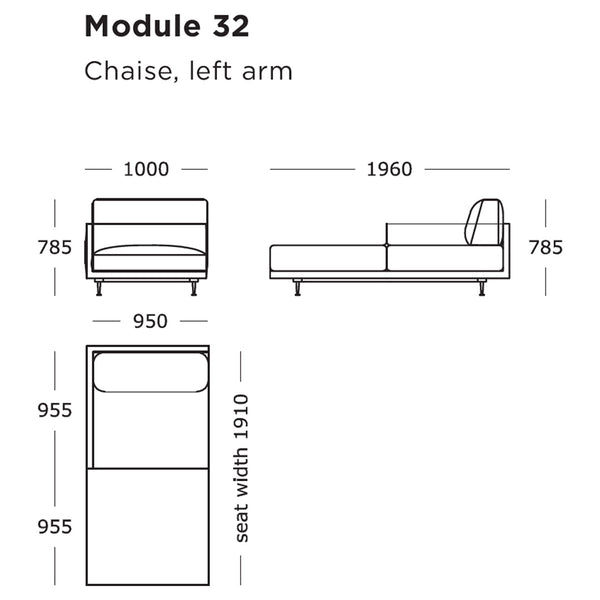 Module 32 (Chaise, Left Arm): 39.4" W x 77.2" D x 30.9" H