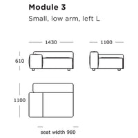 Module 3 (Small, Low Arm, Left L): 56.3" W x 43.3" D x 24" H | 16.1" SH