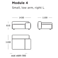 Module 4 (Small, Low Arm, Right L): 56.3" W x 43.3" D x 24" H | 16.1" SH