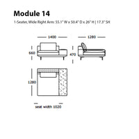 Module 14 (1-Seater, Wide Right Arm): 55.1" W x 50.4" D x 26" H | 17.3" SH