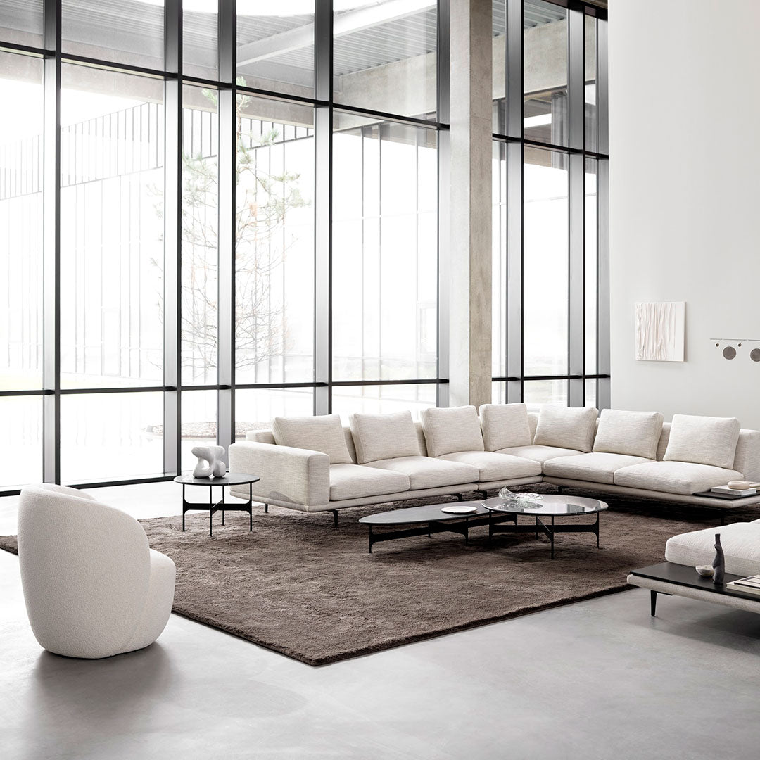 Designed with complementary trays in black stained oak, the Surface Sofa prompts a new take on modularity with engaging levels and dimensions that speak volumes in any spatial context. Thin legs in black powder-coated aluminium add the finishing touches, making the modules soar gracefully above the ground.