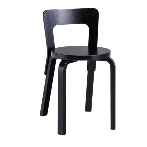 Clean lines and a simple structure define the design of Chair 65. A low, rectangular backrest is formed from a single piece of birch plywood and has a slight curve that forms naturally to the back, offering comfort and support. The height of the backrest allows for the chair to be pushed under a table or desk. The distinctive circular seat and L-shaped legs are part of Alvar Aalto’s standardised system of components. Available in a variety of colours and finishes, Chair 65 also has a smaller sibling, Children’s Chair NE65, which is suitable for children.