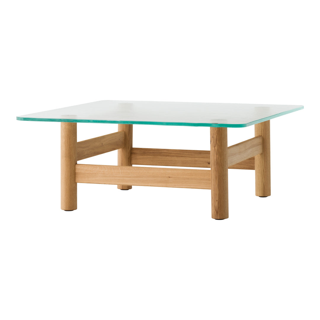 Meticulously constructed in Slovenia, the table features a precisely engineered base composed of shaped and joined wood parts that showcase traditional joinery techniques. Available in three distinctive finishes—Dark Stained Oak, Natural Oak, and Walnut—the sculptural base allows for personalization while maintaining the piece's architectural integrity. The cylindrical legs and vertical support beams create an open framework that highlights the natural beauty of the wood grain while providing robust structural support for the 10mm thick glass top that measures a generous 39.4 inches square with a height of 14 inches.