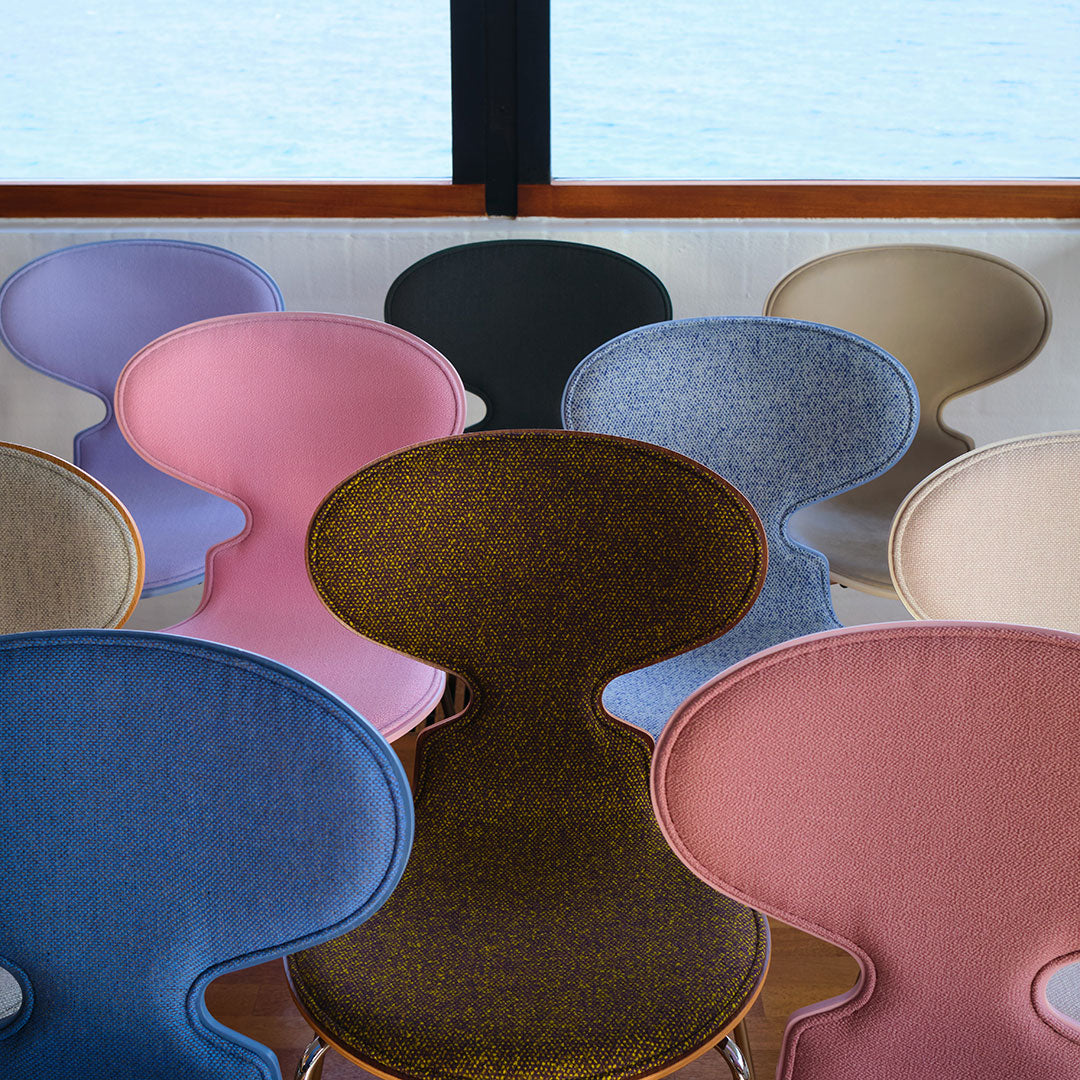 The Ant™ is now available with front upholstery in a wide range of textiles and leathers. The chair's shell is made of pressure moulded veneer and comes in natural, coloured ash or lacquered veneer. The base comes with an option of 3 or 4 legs made of chromed or powder-coated tubular steel.