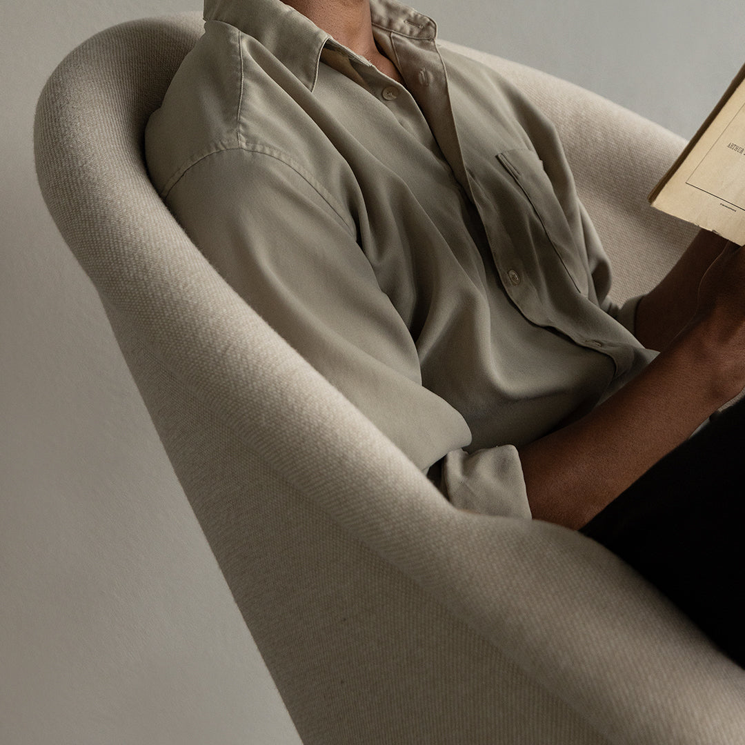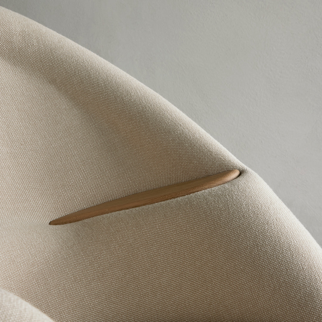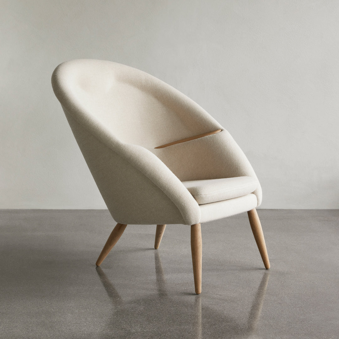 Originally dubbed Model 9, the Oda Chair was an ambitious design from the very beginning. Created by Arnold Madsen in around 1956, the aesthetic reinterpretation of an armchair has a complex horseshoe construction with an integrated headrest and beautifully incorporated armrests in wood. Offering comfortable support, the embracing design was initially – and mistakenly – attributed to Nanna Ditzel. In 2020 it was rightfully credited to Madsen. Constructed according to a vintage version as there are no drawings of the original design, the Oda Chair profiles a sublime level of craftsmanship, evident in the intricacy of its upholstery. Available with legs in natural oak or walnut.