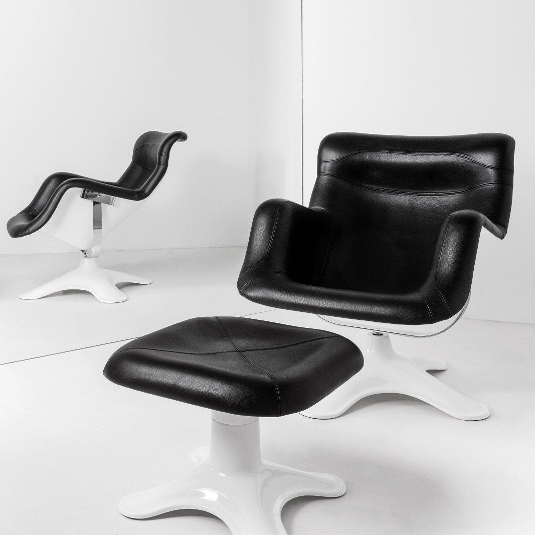 The Karuselli Ottoman is the companion of the Karuselli Lounge Chair and a continuation of designer Yrjö Kukkapuro’s interest in achieving ultimate comfort through a union of function, ergonomics, and organic form. The ottoman consists of an upholstered leather top sitting on a white pedestal base of fibre glass.