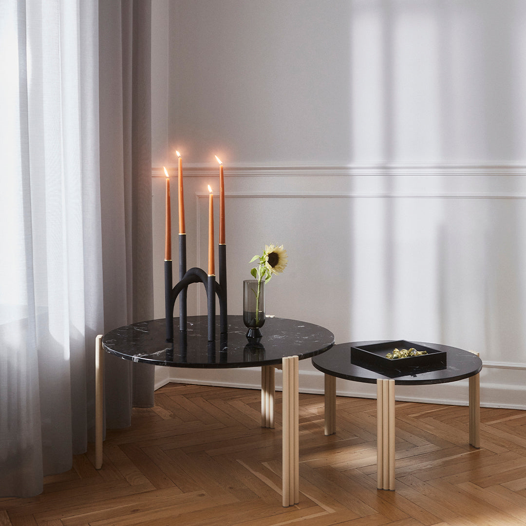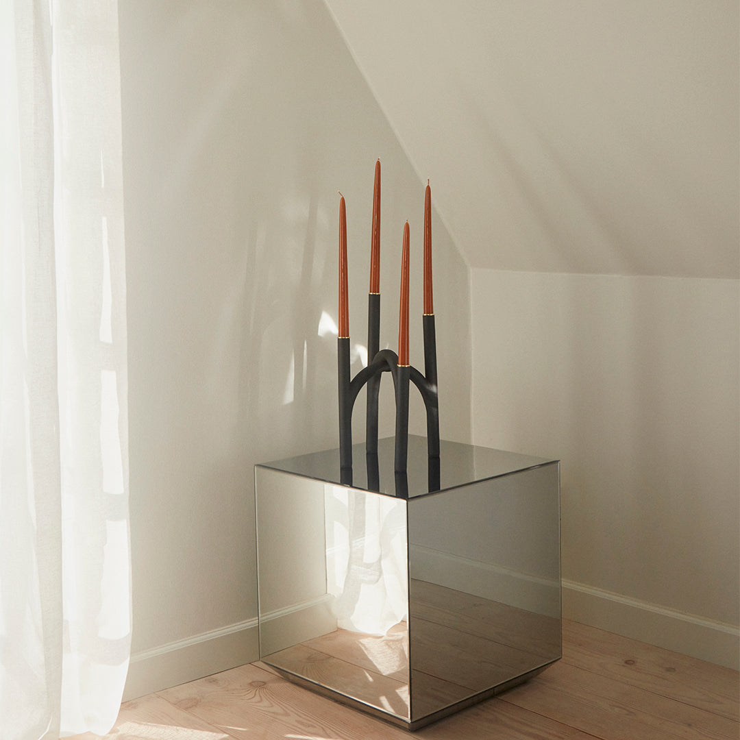 The ANGUI family reinterprets classic traditions of candleholders. With its staggered and sculptured design, the ANGUI table and floor candleholder effortlessly carry candles while adding new and majestic dimensions to any room. Due to its asymmetrical design, the candles will cast intriguing shadows on different levels and are available in different sizes.