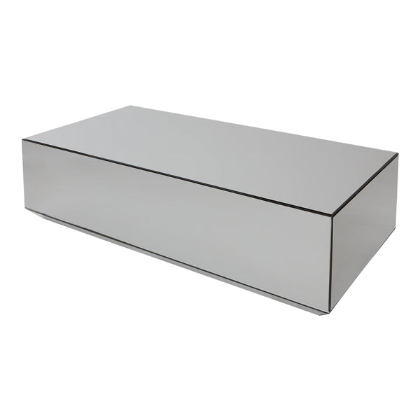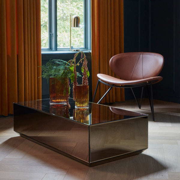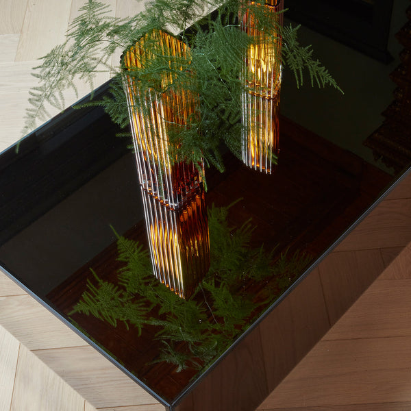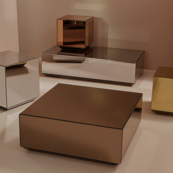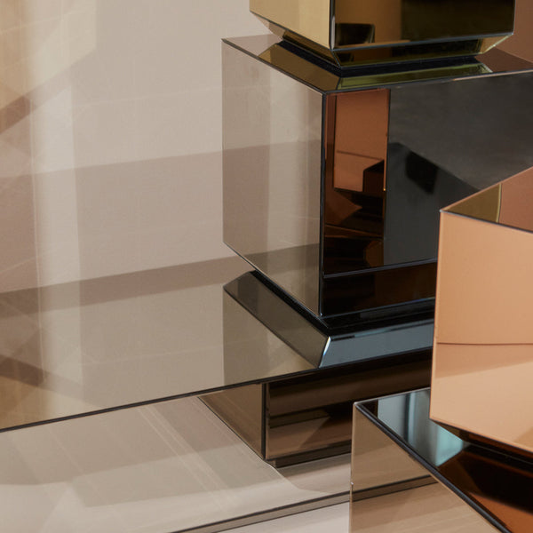 A simple box shape is made much more interesting with mirrors covering its surface. The illusion of space and lovely reflections are the perfect result of the Speculum tables and candleholders. Add colours to the mixture and the result will be even more interesting.