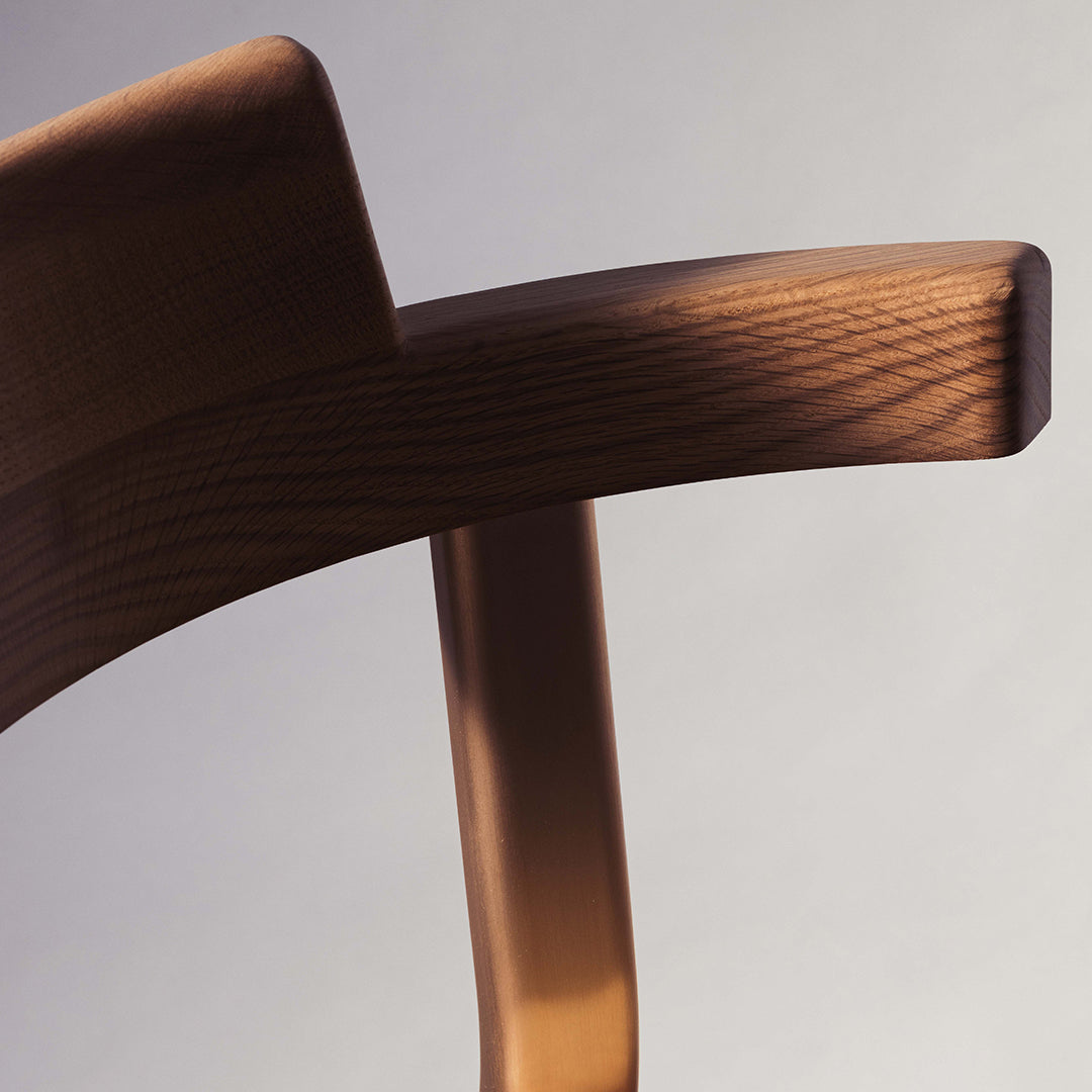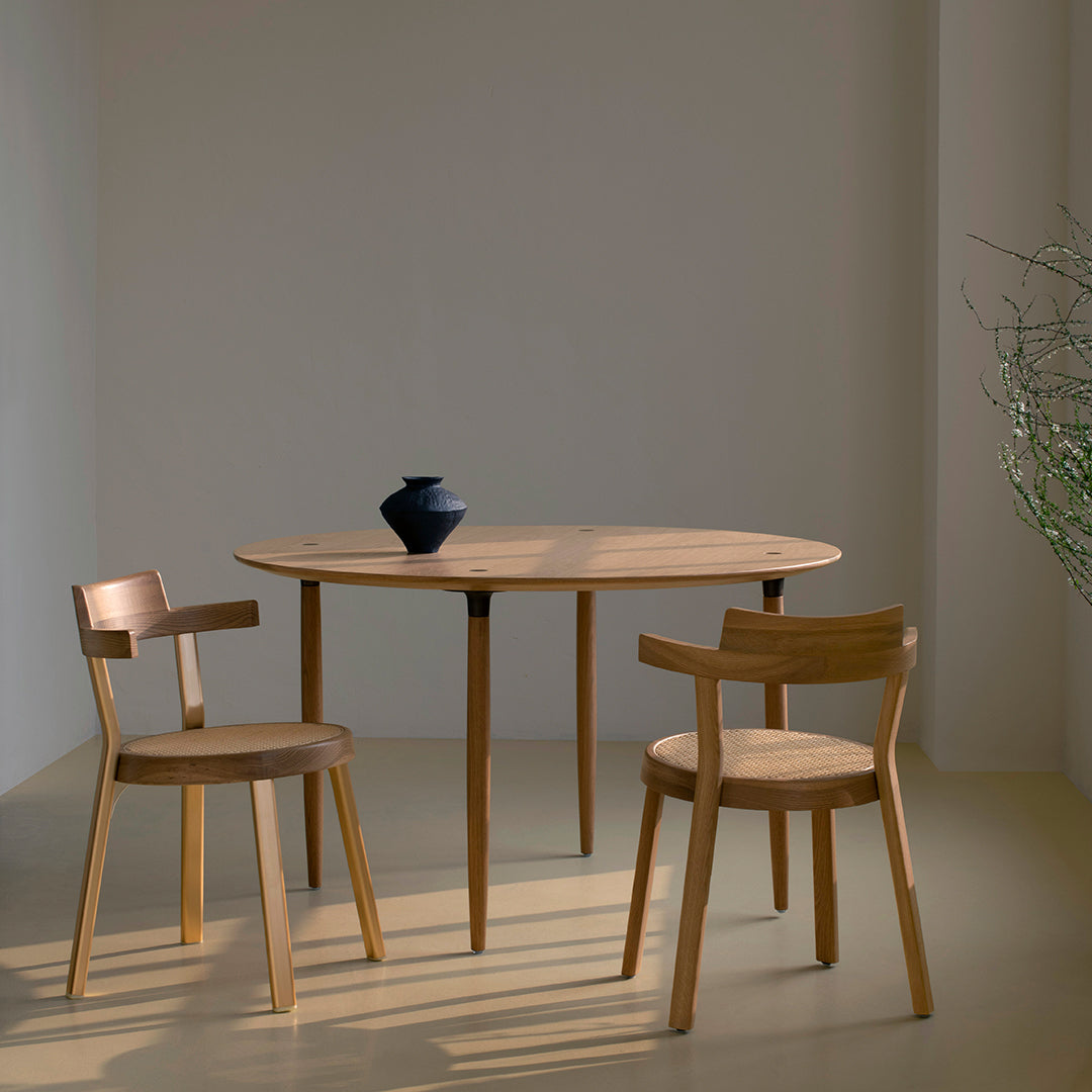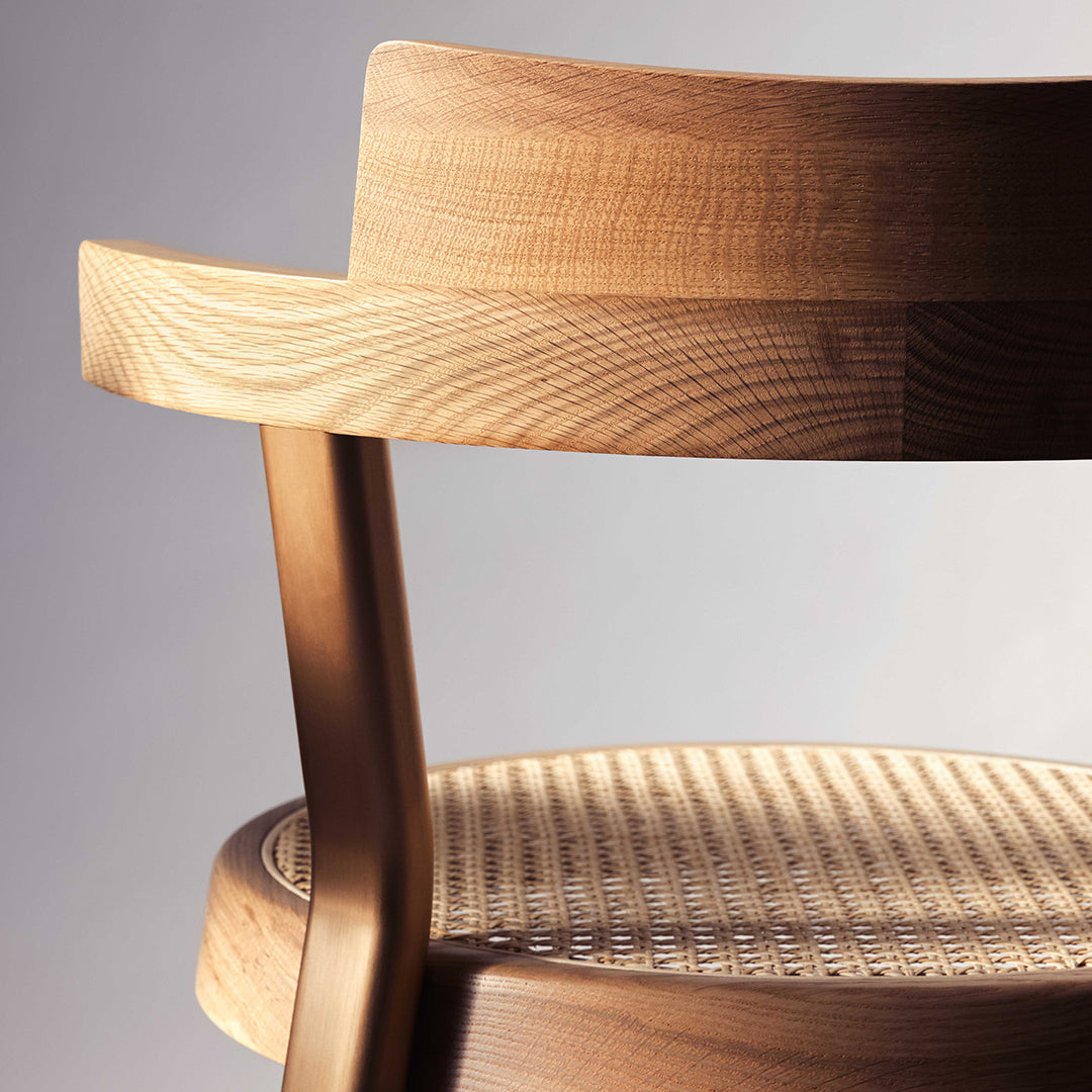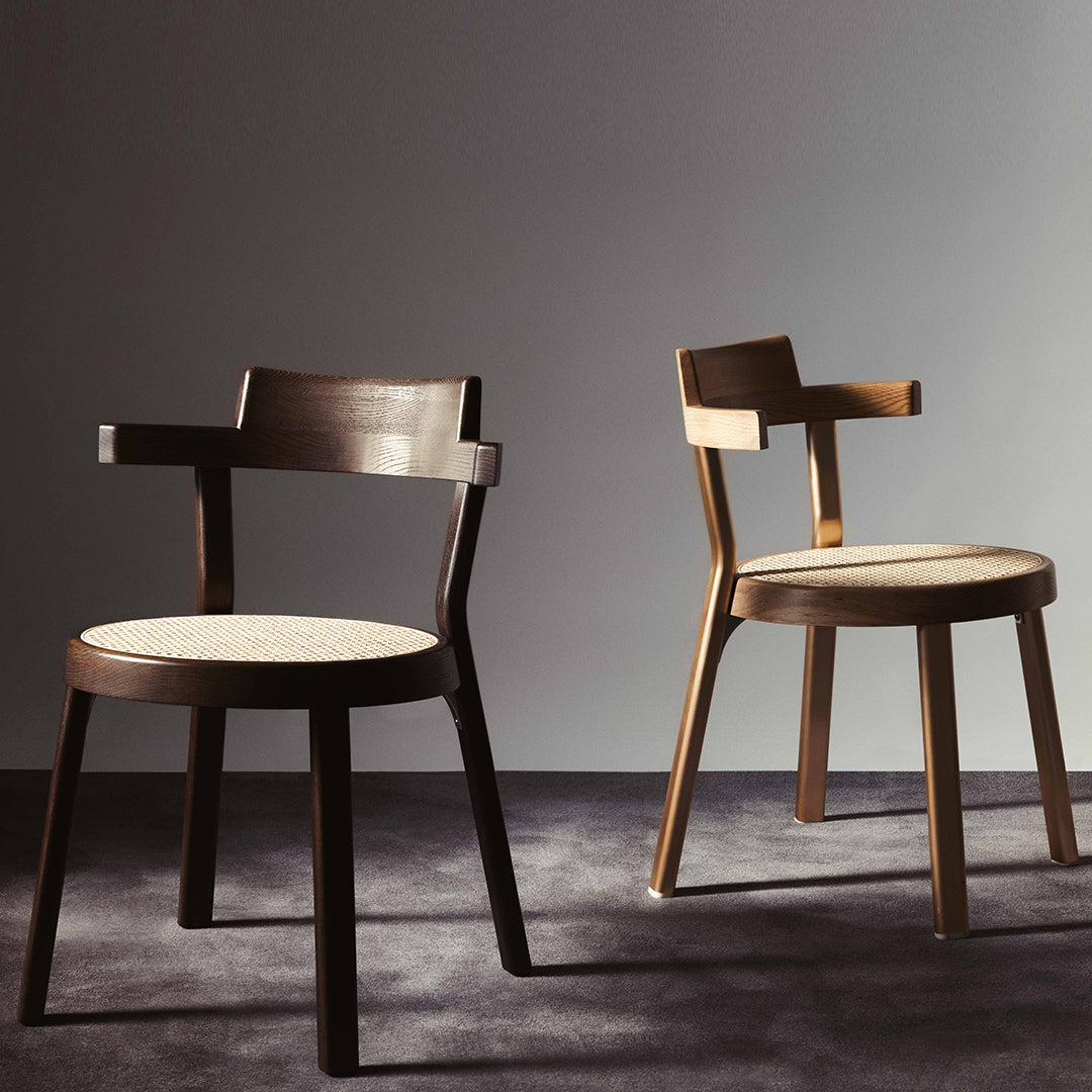 Pagoda is a collection of chairs inspired by the classic café chairs of 19th century Vienna. The chair is supremely light and compact with a structure that has been reduced to its very essence. The chair consists of only six pieces – delivering good craftsmanship and efficiency while allowing multiple material configurations. The chair’s circular seat stems from rationalization while symbolizing the “Way of Nature” or “oneness” in Chinese culture. Cantilevered arms and back subtly reference Pagoda gates, giving the chair its personality while also eliminating the need for an arm and armless version.