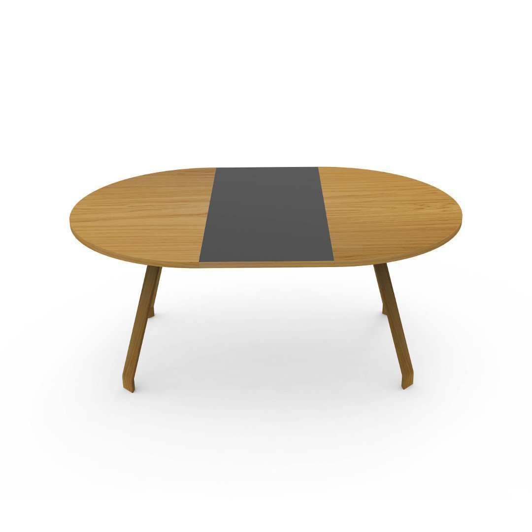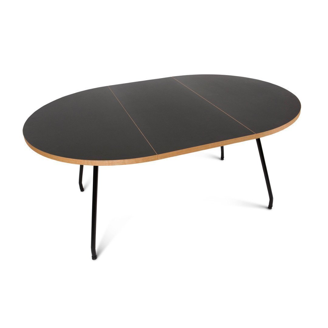 The dining table is an extension table, and the table top comes in oak veneer or black linoleum both with a decorative oiled oak edge.