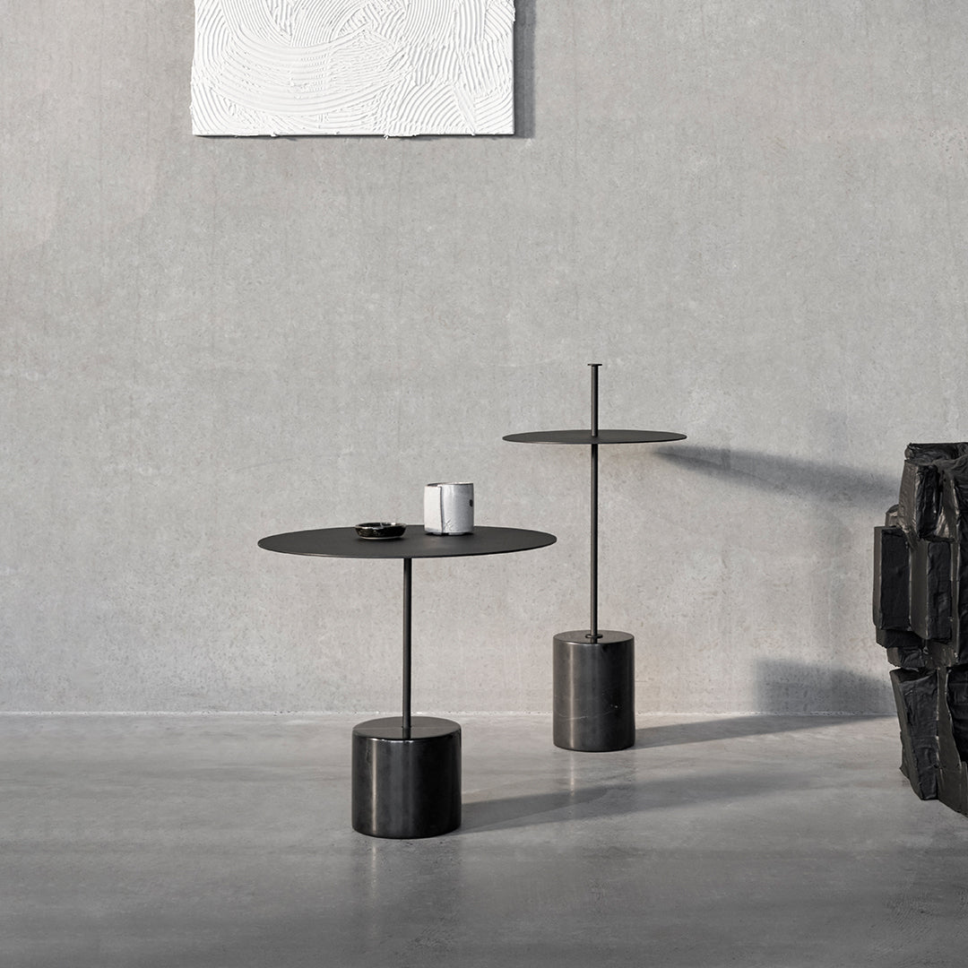 The low version (17.3" diameter and 15.7" height) provides an expansive surface ideal for displaying curated objects or serving as a functional complement to deep seating arrangements. Its taller counterpart (12.6" diameter and 20.1" height) offers a more slender profile perfect for smaller spaces or as an elegant drink table alongside lounge chairs and sofas.