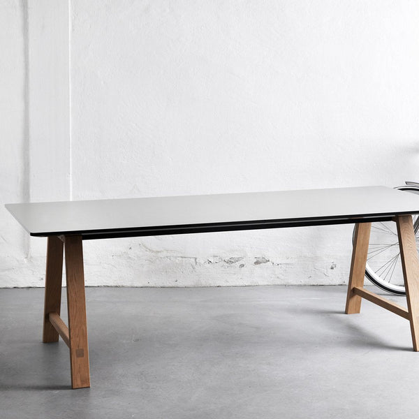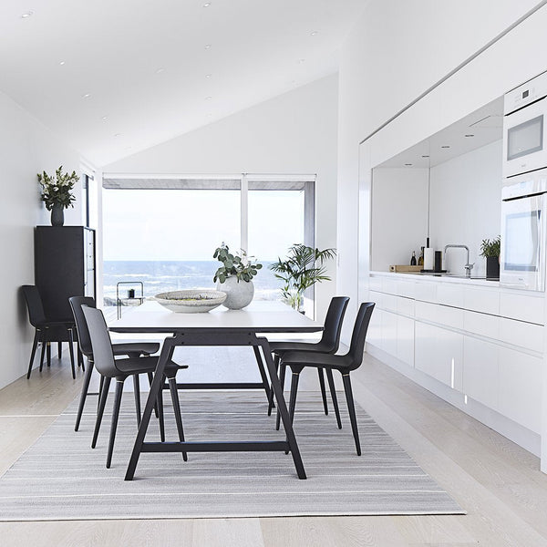T1 is a table with character and lightness. A timeless style that blends with interiors in all modern homes. The tabletop is with hard-wearing high-pressure laminate and the legs are made of solid wood with elegant details such as visible dowelling. The table comes in two versions - with a fixed tabletop or as an extendable table.