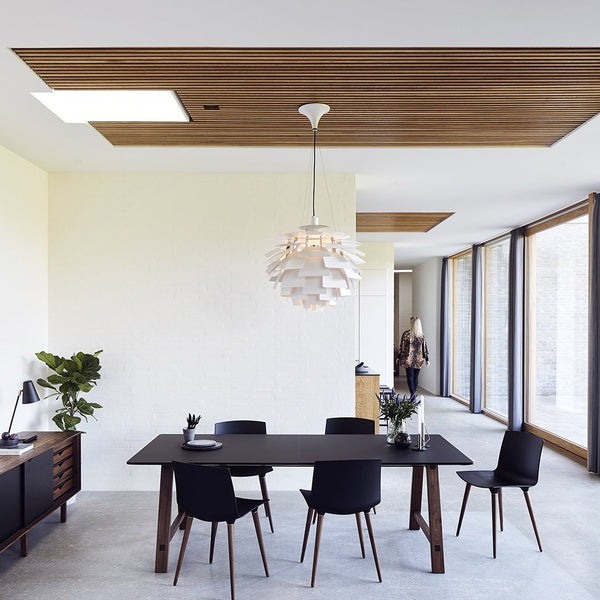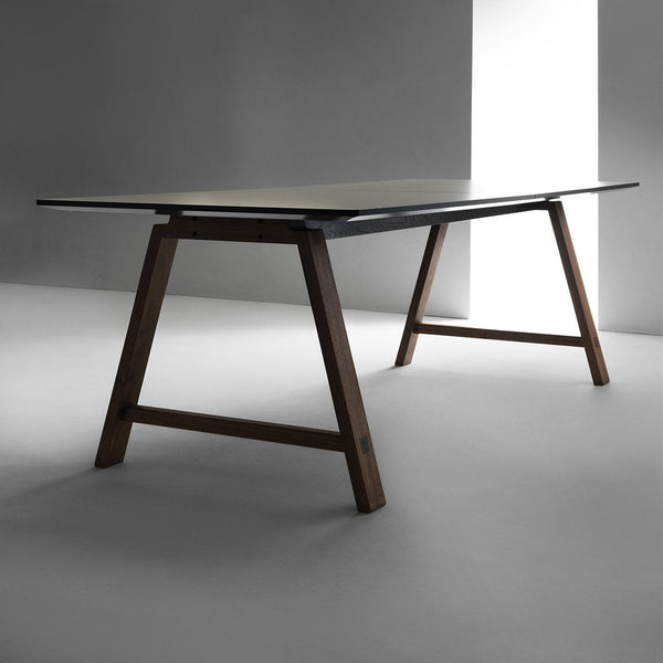 T1 is a table with character and lightness. A timeless style that blends with interiors in all modern homes. The tabletop is with hard-wearing high-pressure laminate and the legs are made of solid wood with elegant details such as visible dowelling. The table comes in two versions - with a fixed tabletop or as an extendable table.