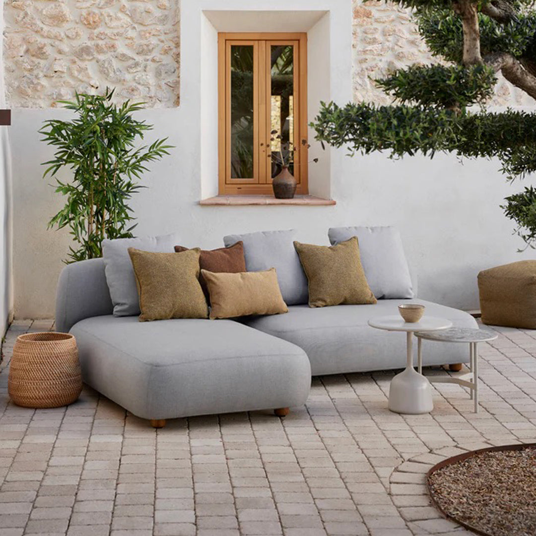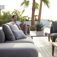Capture is comfortable and informal lounge furniture for your outdoor space, with iconic soft shapes. A perfect balance between laid-back coziness and a modern curved design expression. Capture is a fully upholstered modular sofa, with resemblance to indoor lounges, made in durable weather resistant Cane-line AirTouch fabric. The sofa has a low seating height with an ideal depth and firm cushions made for your comfort which forms a great space for informal chats and togetherness. Let yourself get captured in the moment and just relax in a calm oasis.