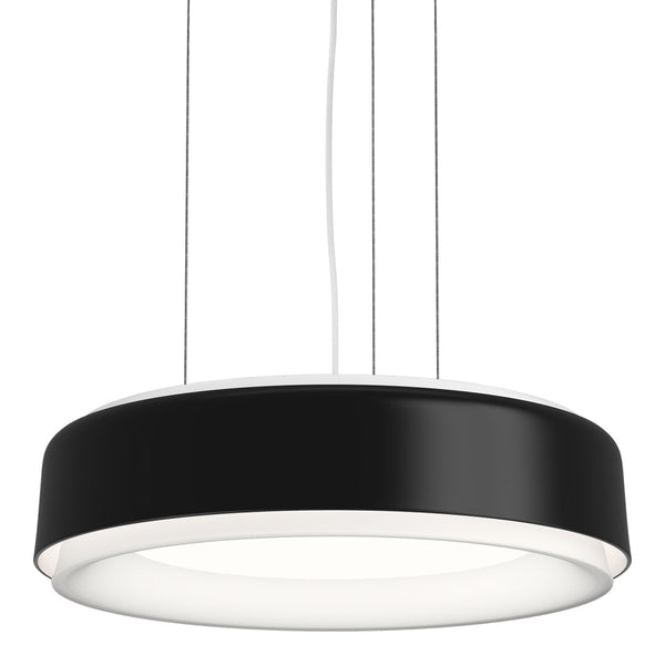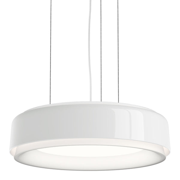 The circular luminaire emits a combination of softly diffused, glare-free, downwardly directed light and reflected indirect light from its curved upper rings. A large angled reflector encircles the diffuser and reduces the contrast around the edge. The top reflector is perfectly curved to distribute uplight at a broad angle. A colored outer shade surrounds the reflector and creates an interreflection of light, resulting in a graceful glow on the outside of the top and bottom reflectors. In total, it creates four rings of light surrounding the central diffuser.