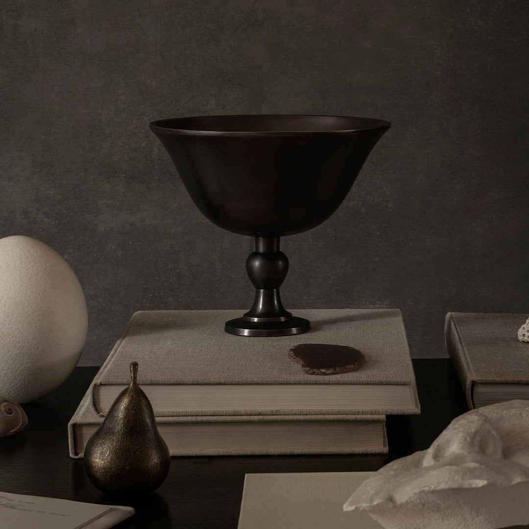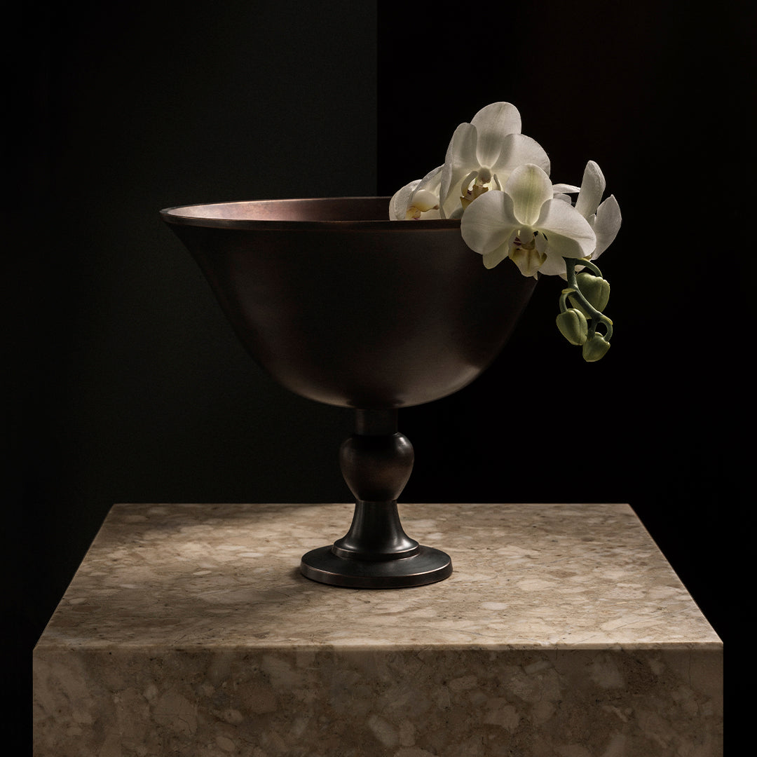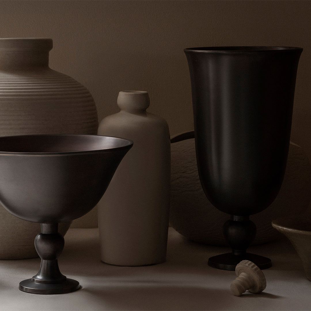 Looking to the poppy for both its design cues and its French name, the Pavot collection echoes ancient craftsmanship in sculptural, footed vessels with a brown bronzed finish. Designed with intention by Colin King for Audo, each piece in the series offers its own distinct character while complementing the others as part of a unified aesthetic. As centerpieces on a table, shelf or windowsill, filled or unfilled, they bring a captivating blend of tradition and modernity to spaces. Together they form a trio that invites creativity in display and use, transforming spaces with their dynamic interplay of form and purpose.