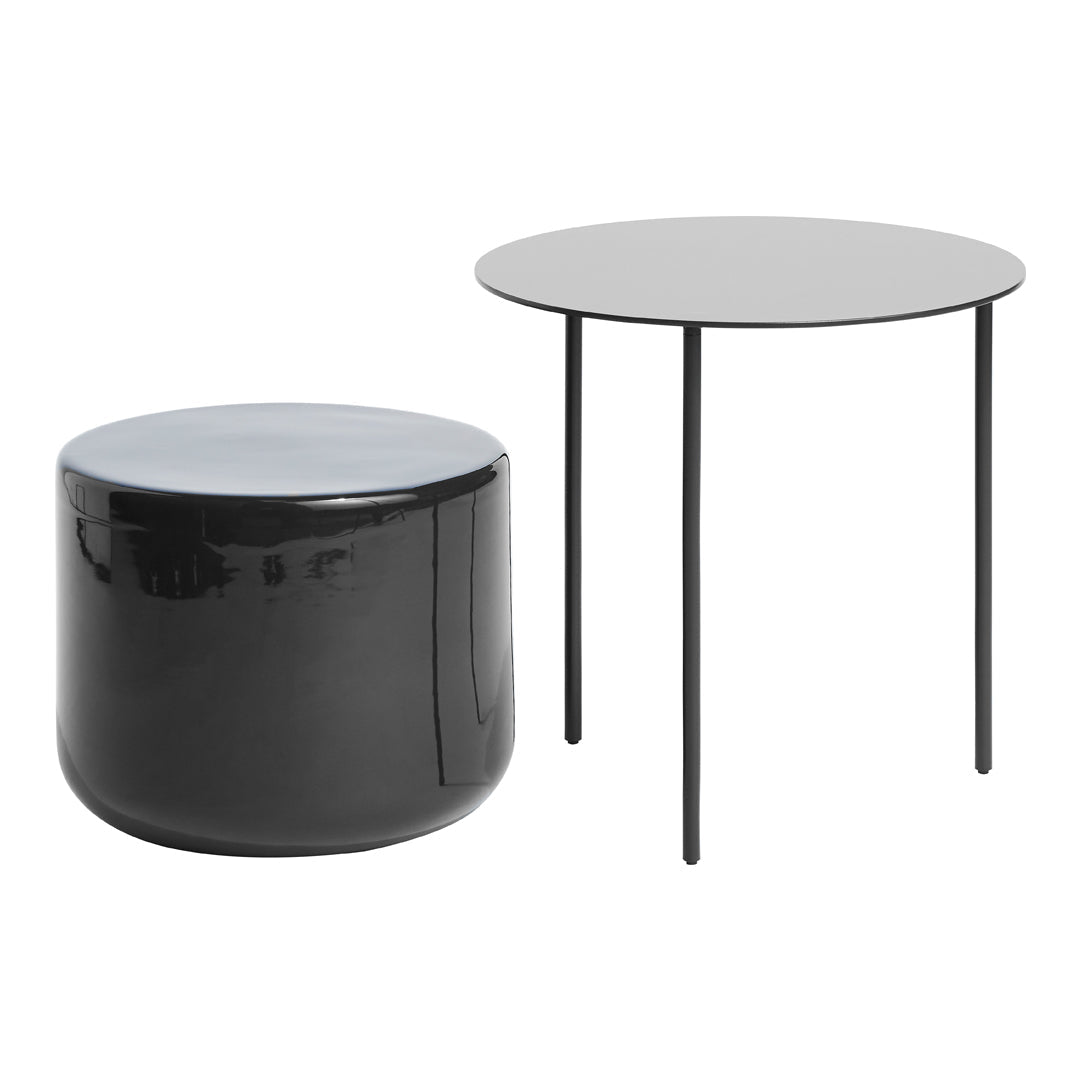 The Pair Side Table collection consists of three variations of a pair of tables, with one table overlapping the other to create a contrast of solid materials and surfaces. The lower base table is uniquely crafted in glazed ceramic, while the higher table is made of matte powder-coated steel and stands light on its three feet. The Base Table can be placed either beside the higher table, providing an additional surface, or to create storage in between.