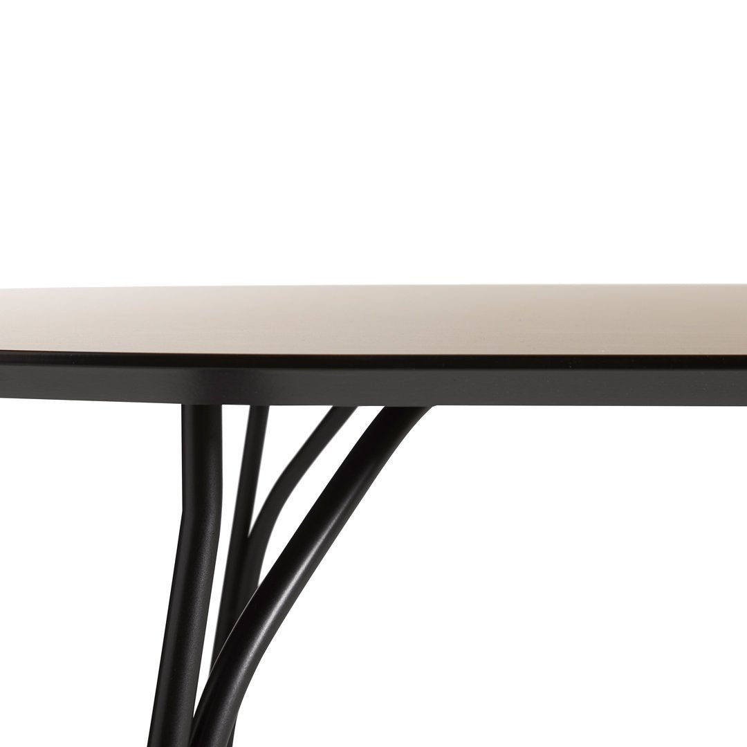 Tree's sleek metal legs call to mind branches of a tree. The two steel tubes rise from the ground side by side, before their path separates to support the tabletop in several places, while forming an arborescent pattern inspired by the lightness of trees rising. Like a bundle of stems, the legs lift the circular top illustrating the leafy canopy while the round shape invites conversation and gatherings with family and friends.