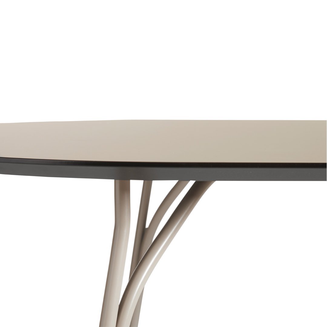 Tree's sleek metal legs call to mind branches of a tree. The two steel tubes rise from the ground side by side, before their path separates to support the tabletop in several places, while forming an arborescent pattern inspired by the lightness of trees rising. Like a bundle of stems, the legs lift the circular top illustrating the leafy canopy while the round shape invites conversation and gatherings with family and friends.