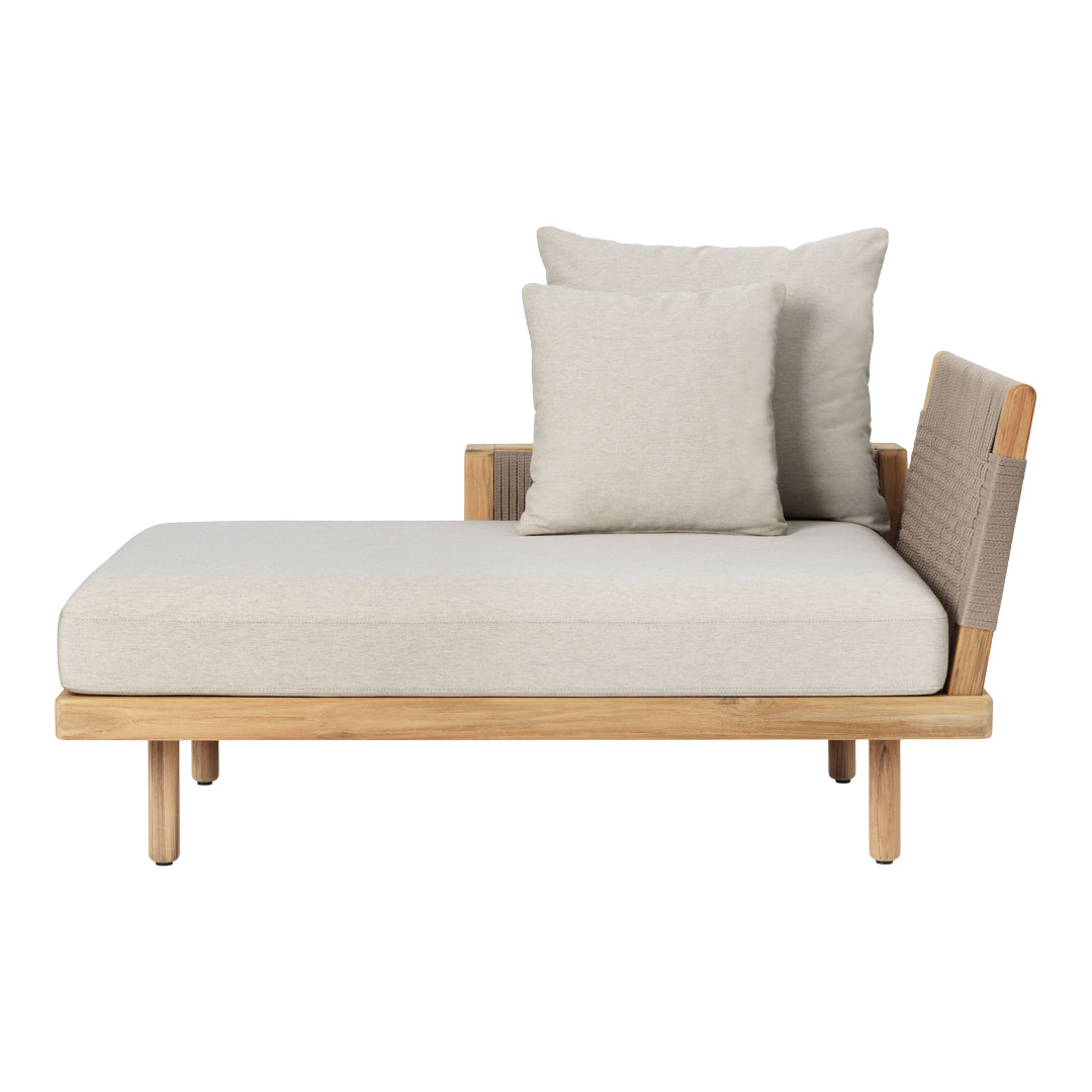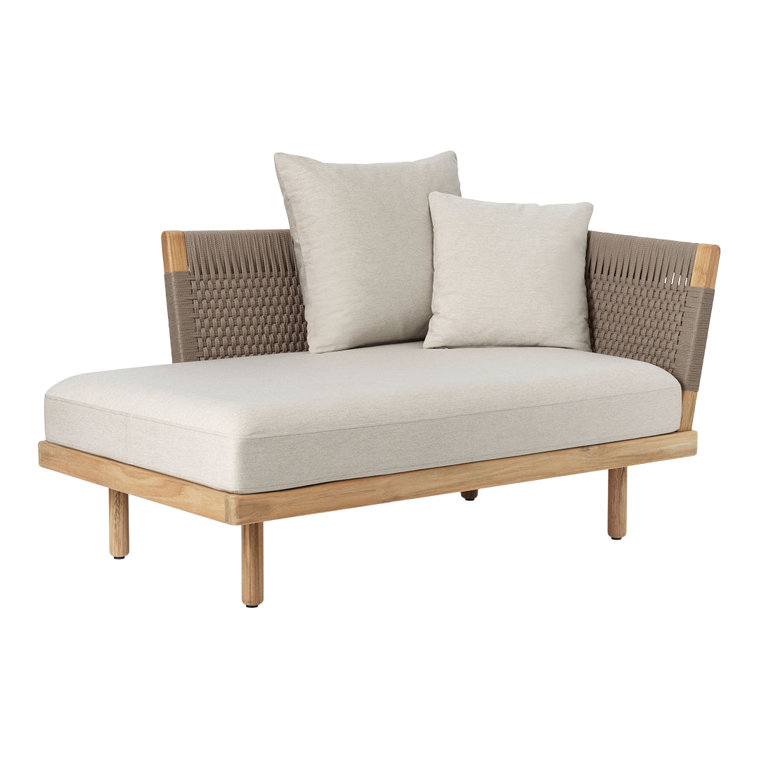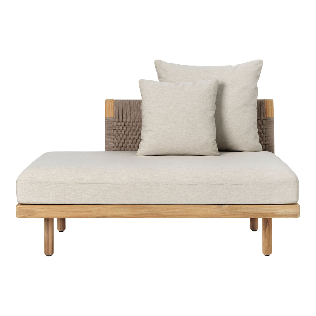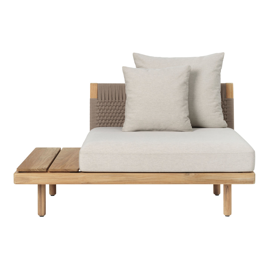 Designed by EOOS, the Embrace Outdoor Lounge Series is characterized by balancing soft upholstery and stringent wood perfectly. The modular sofa encourages outdoor relaxation with its comfortable upholstery and laid-back look, and, at the same time, it has a tight and contemporary idiom with its woven arm- and backrests and teak frame