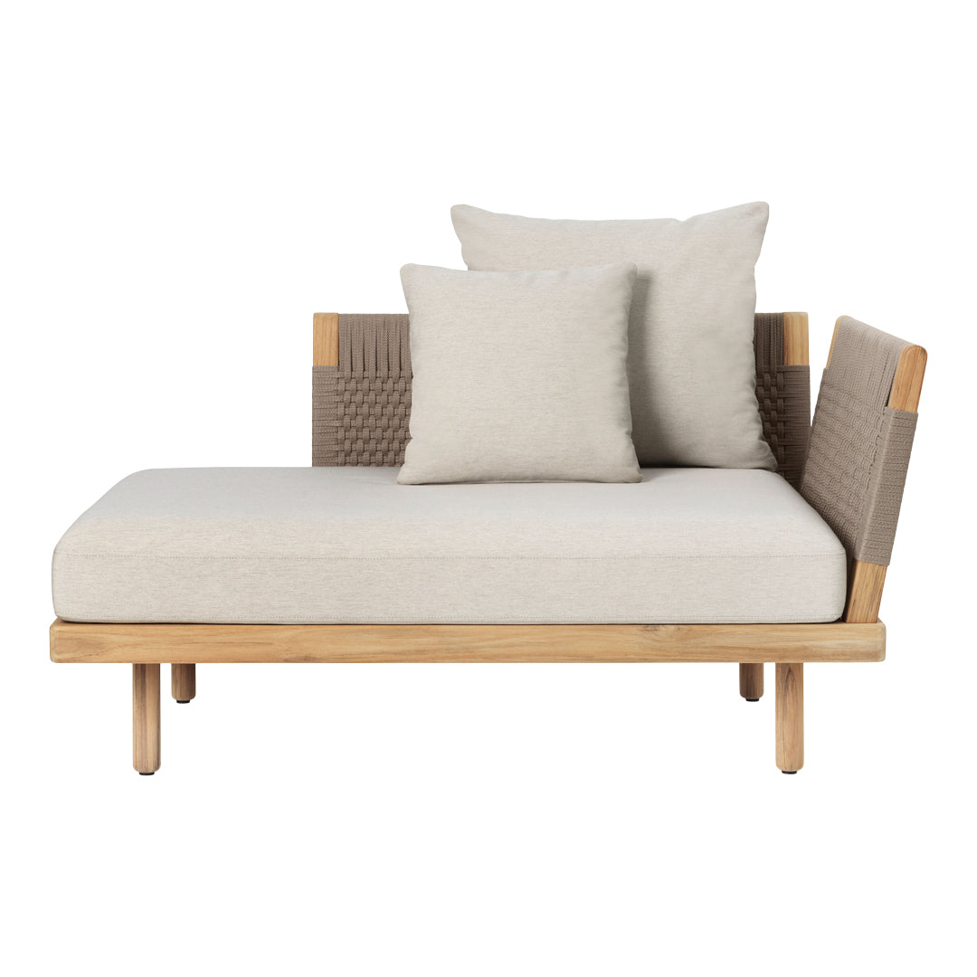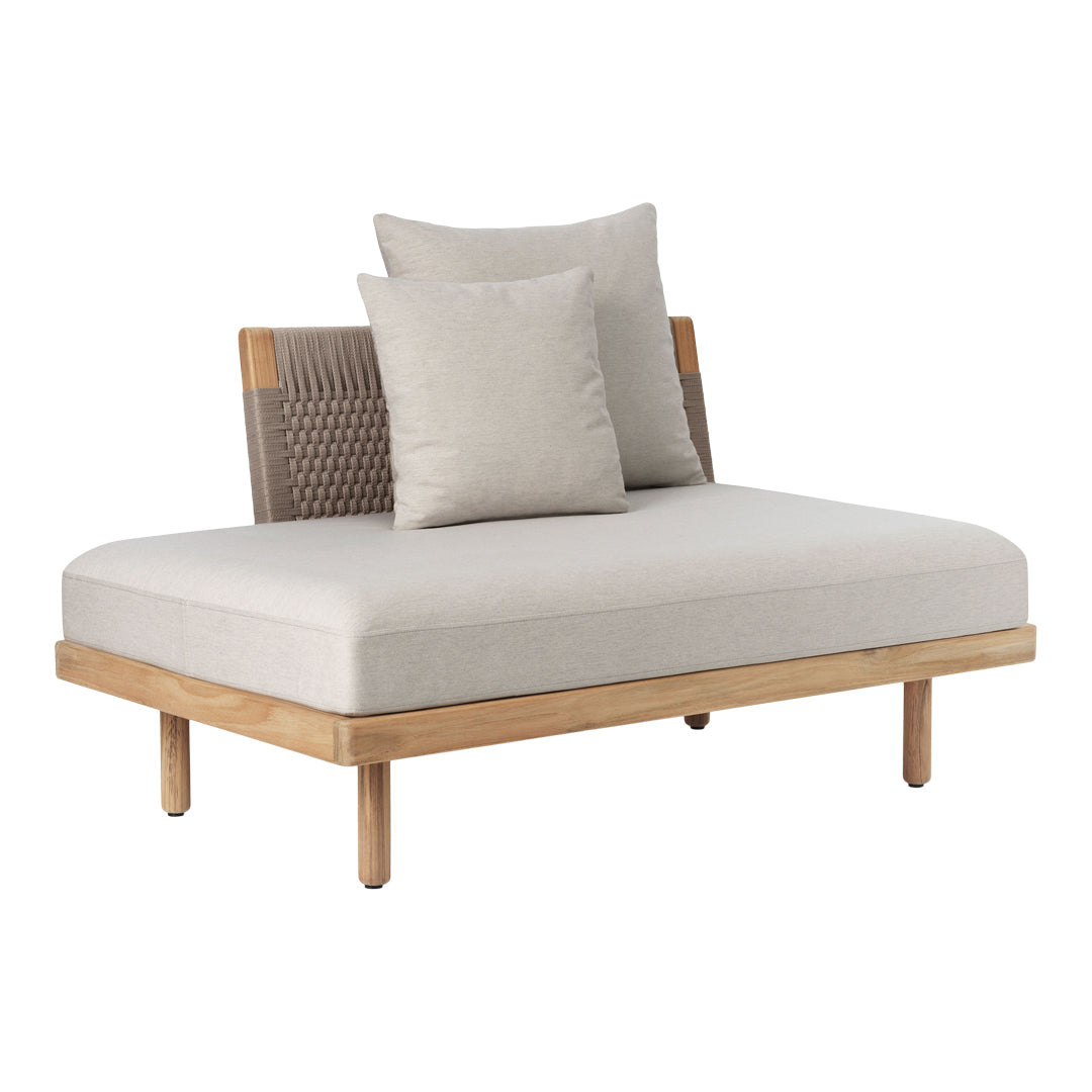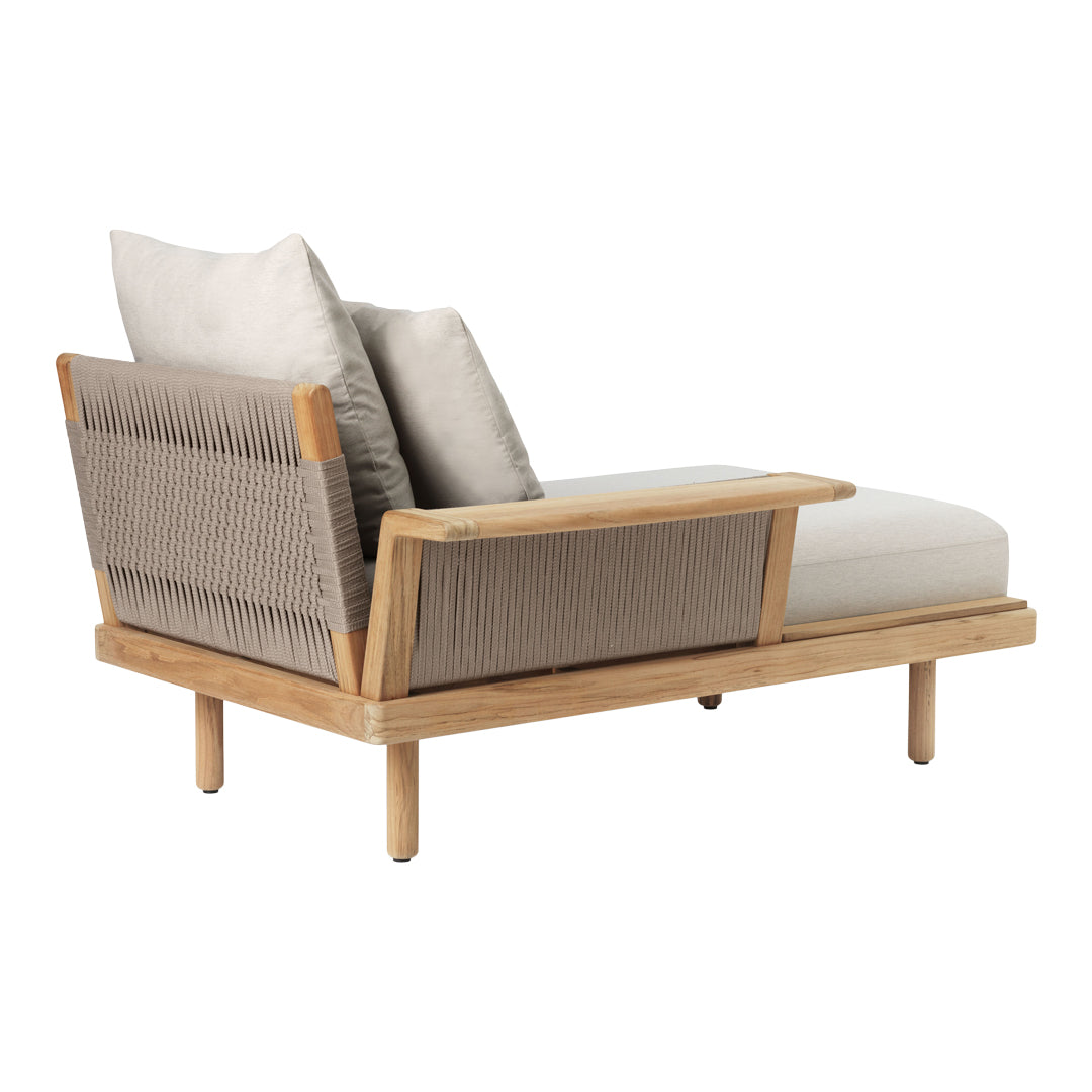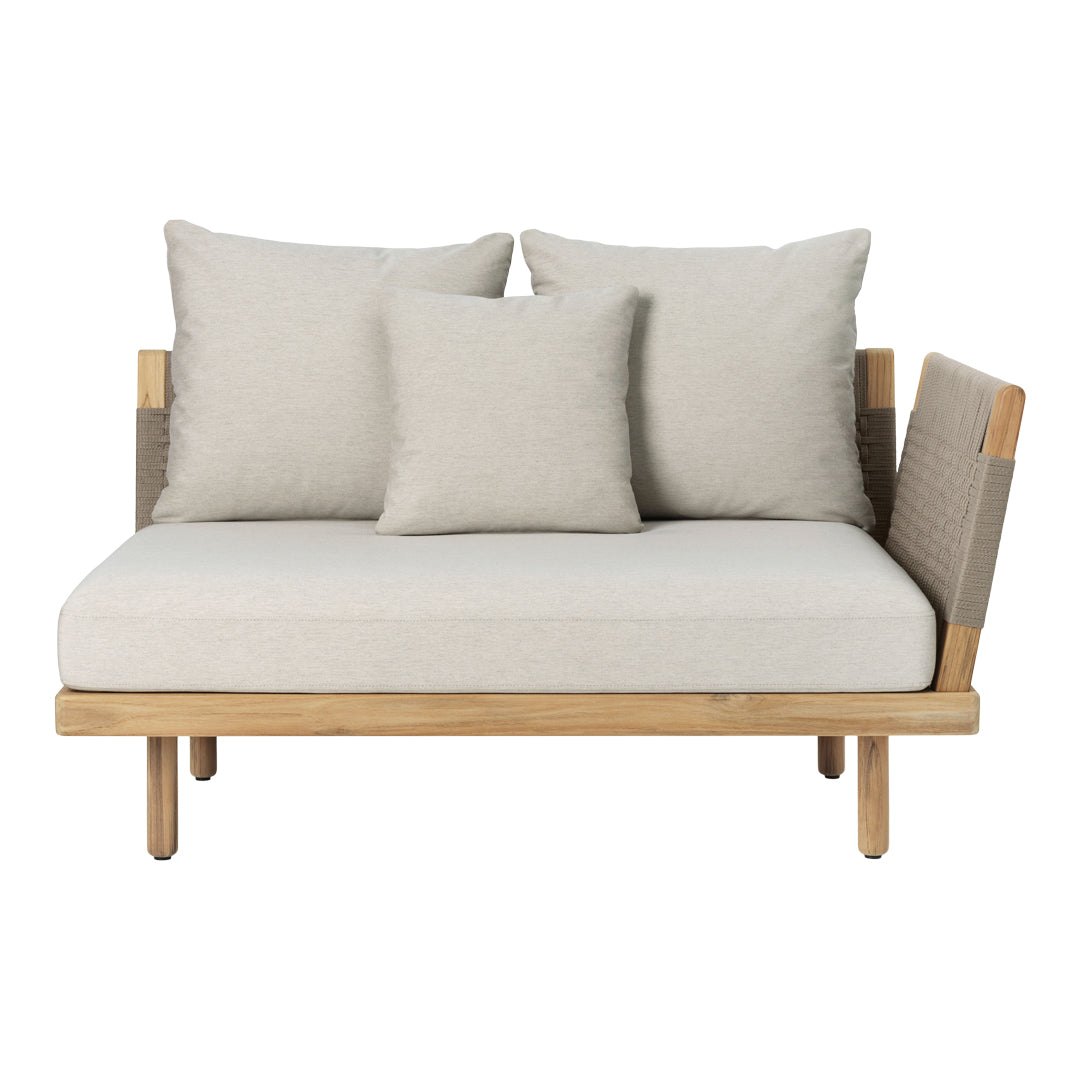 Designed by EOOS, the Embrace Outdoor Lounge Series is characterized by balancing soft upholstery and stringent wood perfectly. The modular sofa encourages outdoor relaxation with its comfortable upholstery and laid-back look, and, at the same time, it has a tight and contemporary idiom with its woven arm- and backrests and teak frame