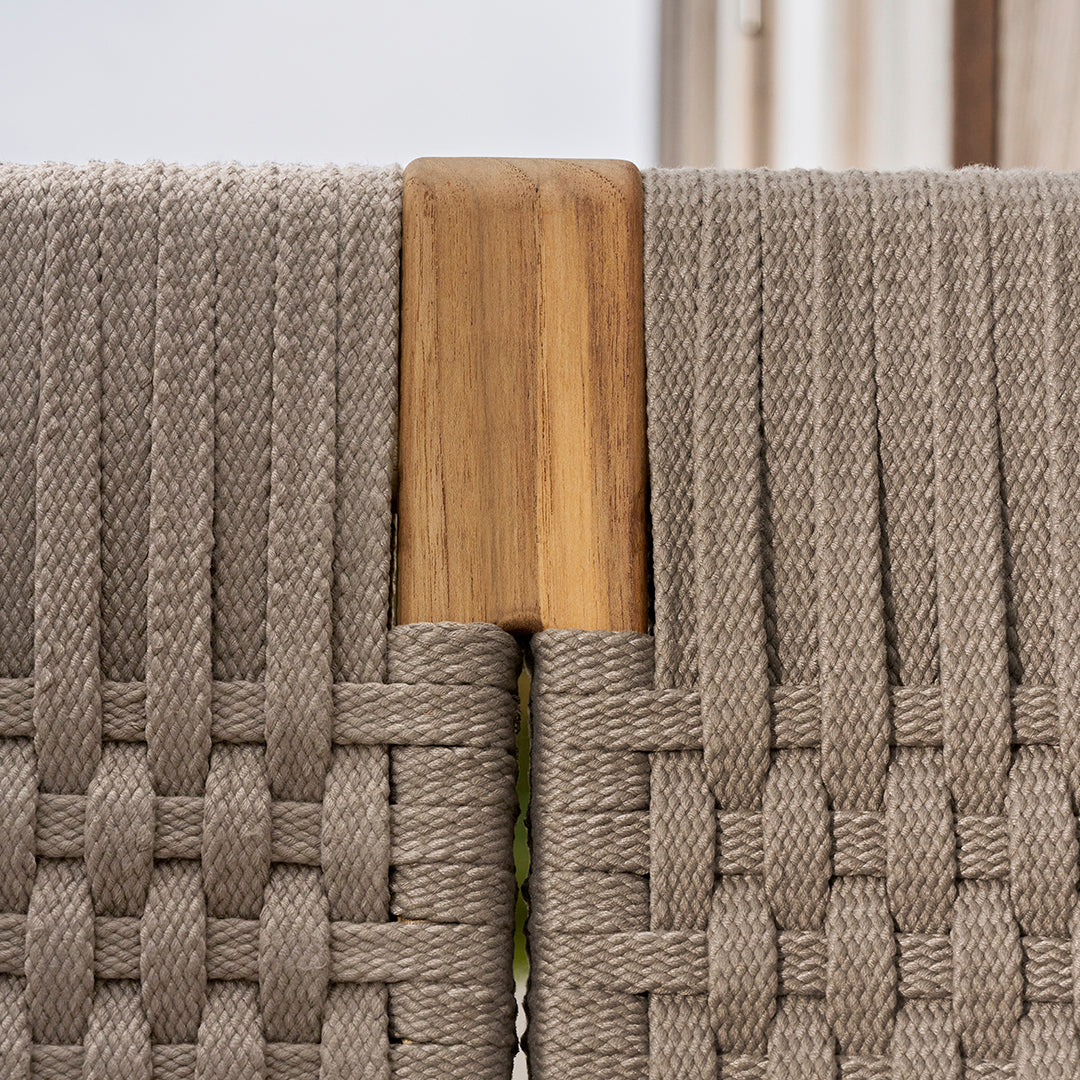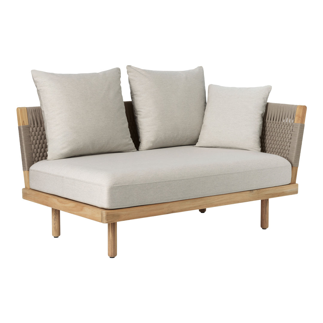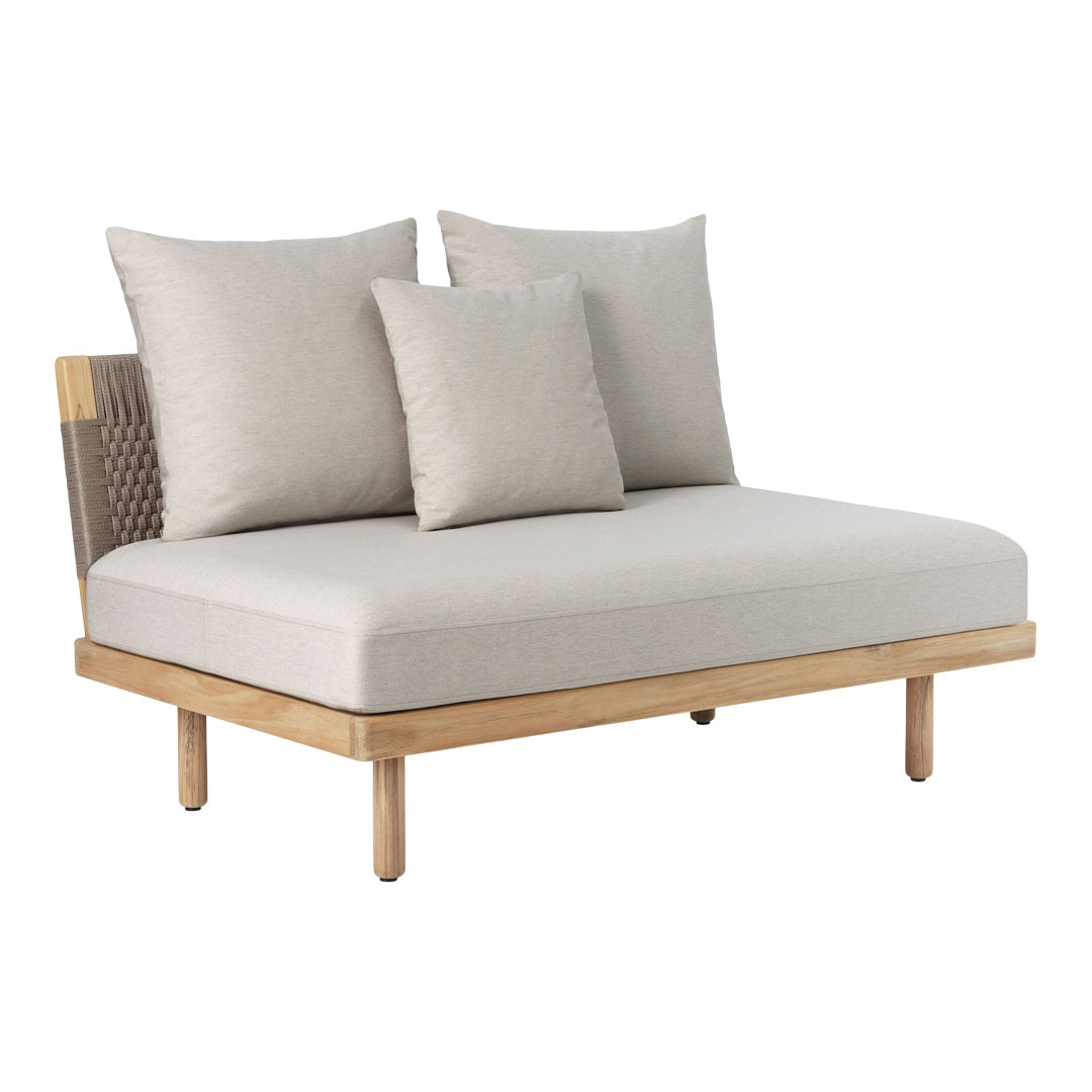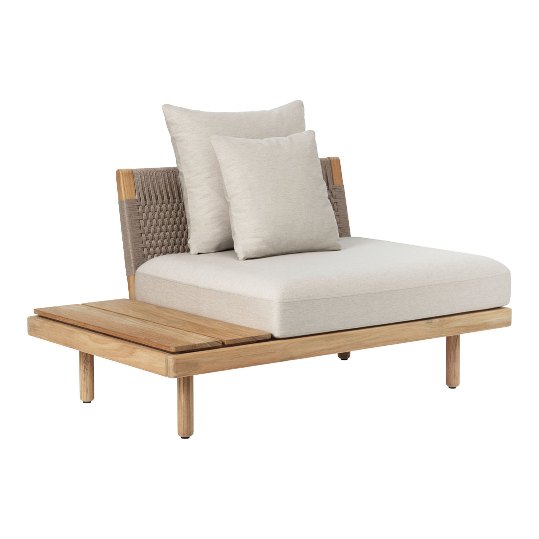 Designed by EOOS, the Embrace Outdoor Lounge Series is characterized by balancing soft upholstery and stringent wood perfectly. The modular sofa encourages outdoor relaxation with its comfortable upholstery and laid-back look, and, at the same time, it has a tight and contemporary idiom with its woven arm- and backrests and teak frame