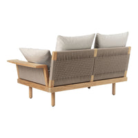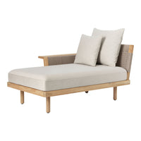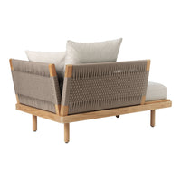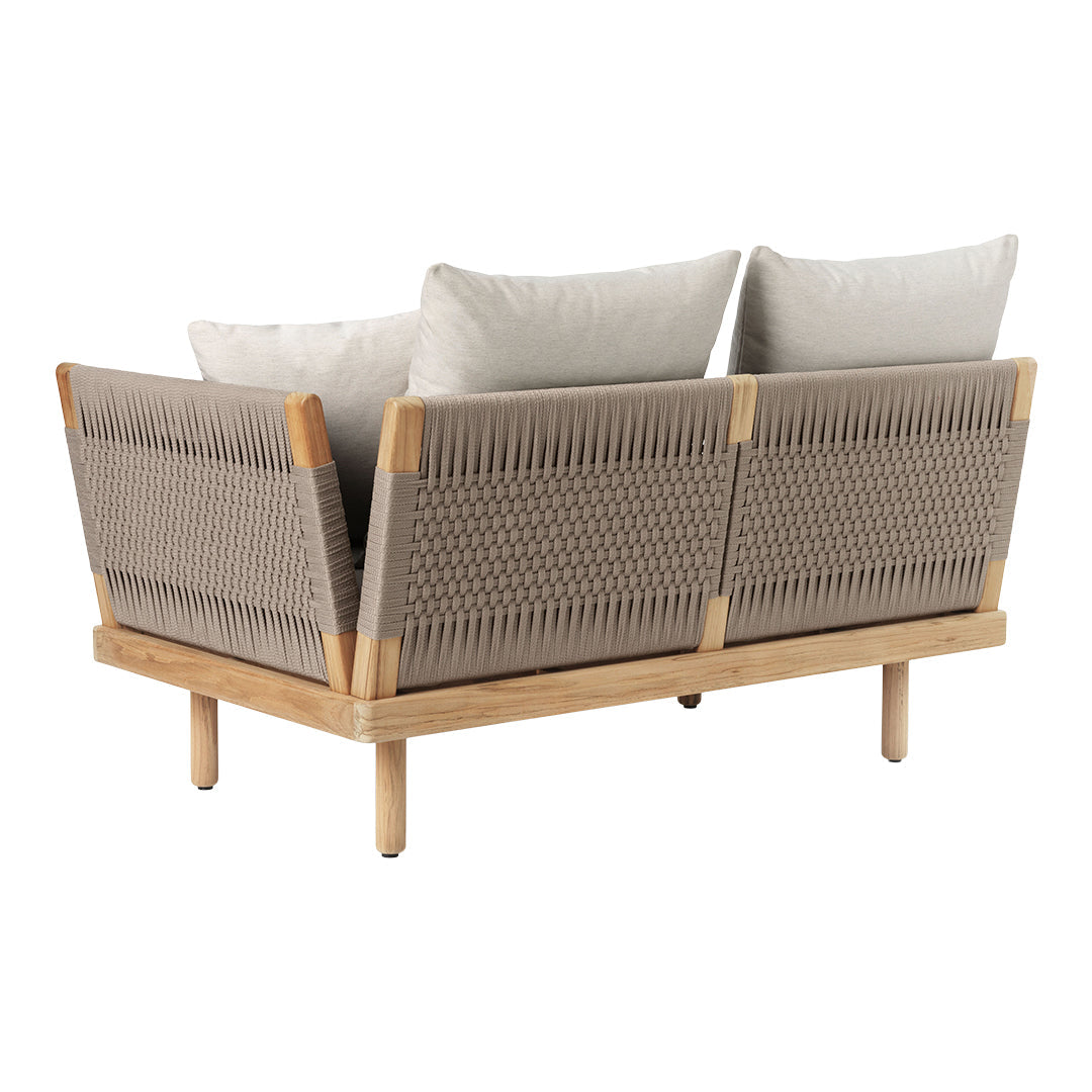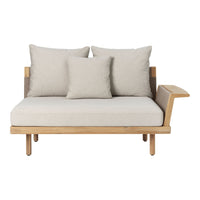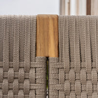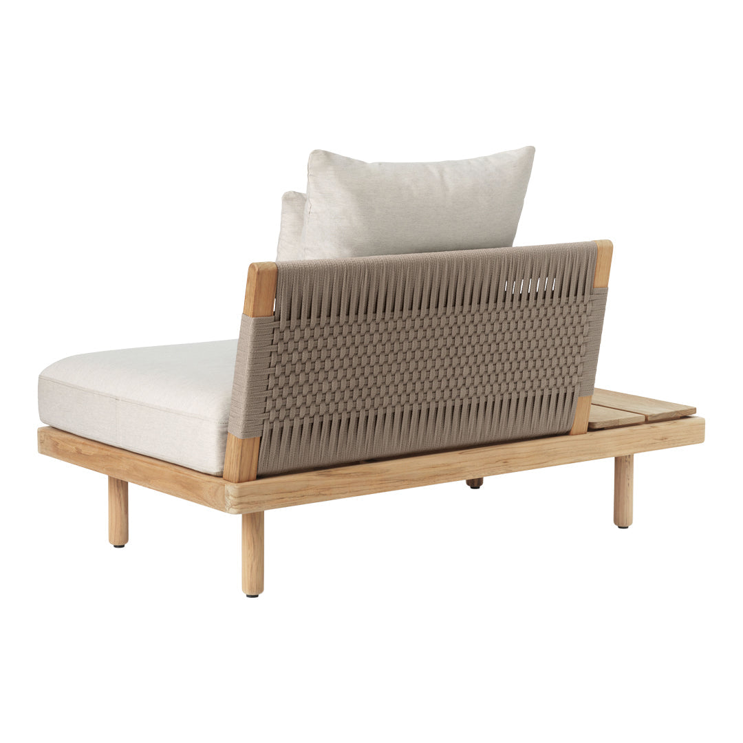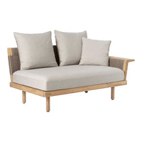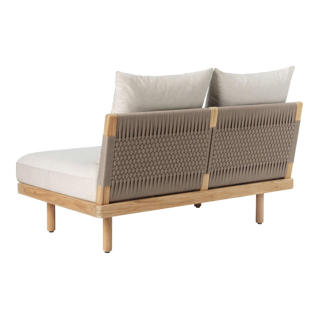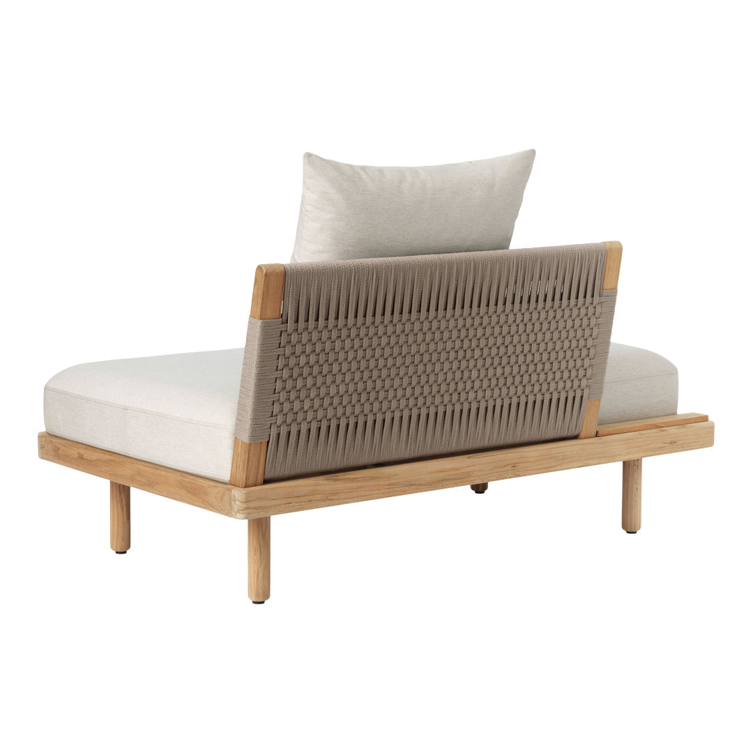 Designed by EOOS, the Embrace Outdoor Lounge Series is characterized by balancing soft upholstery and stringent wood perfectly. The modular sofa encourages outdoor relaxation with its comfortable upholstery and laid-back look, and, at the same time, it has a tight and contemporary idiom with its woven arm- and backrests and teak frame