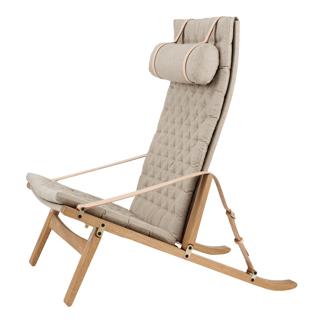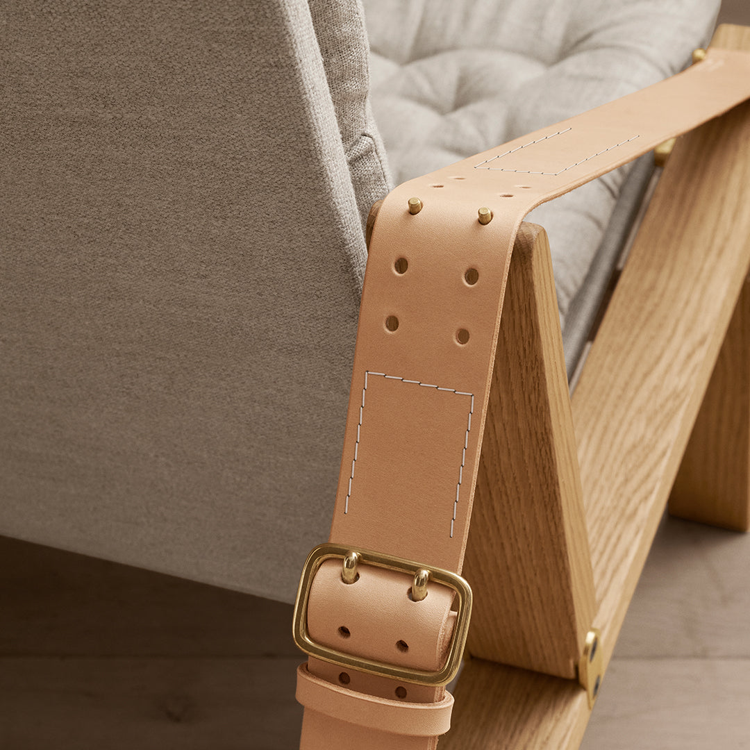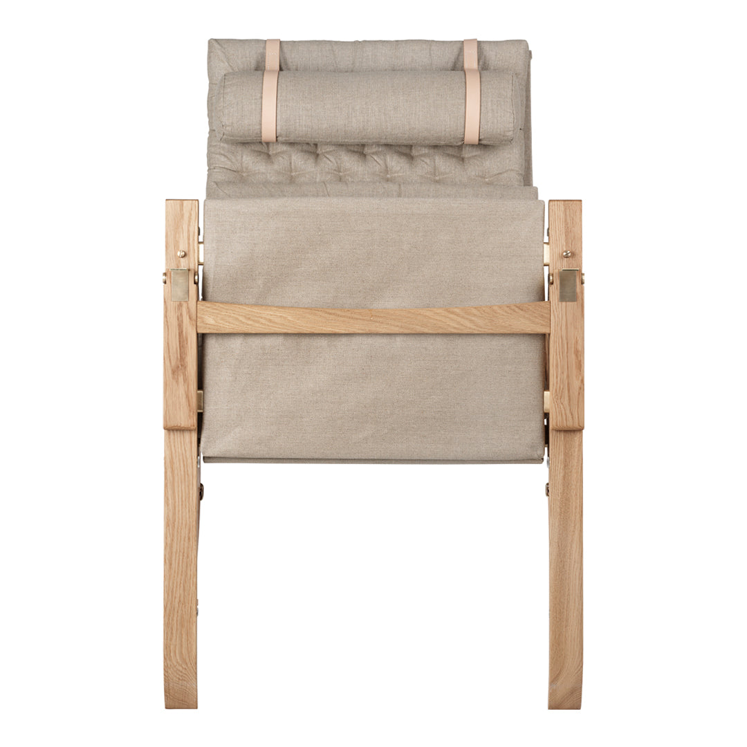 Available in a high and low back version, the solid oak frame and curved rear legs are shaped for stability. The back and seat, fitted with corresponding cushions, are upholstered in stitched linen canvas to provide an elegant expression and supreme sitting comfort. The adjustable backrest folds completely and saddle leather armrests complete the design, giving it a distinctive expression full of character.