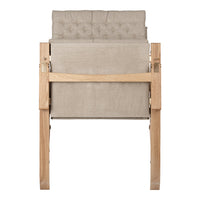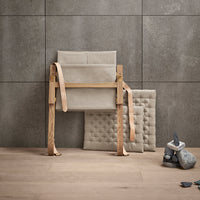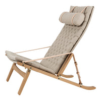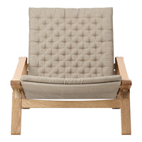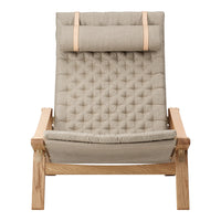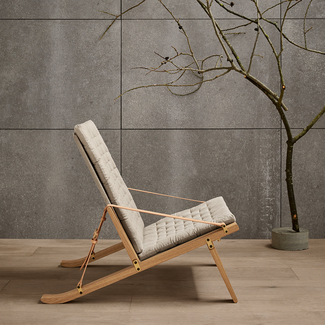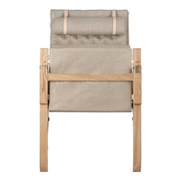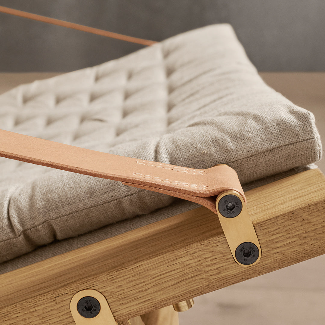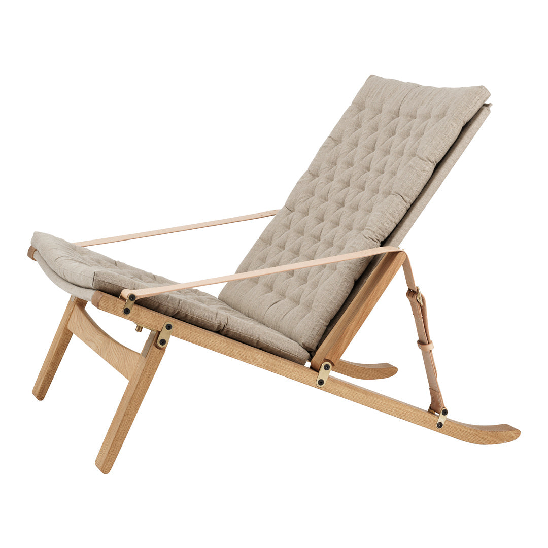Available in a high and low back version, the solid oak frame and curved rear legs are shaped for stability. The back and seat, fitted with corresponding cushions, are upholstered in stitched linen canvas to provide an elegant expression and supreme sitting comfort. The adjustable backrest folds completely and saddle leather armrests complete the design, giving it a distinctive expression full of character.