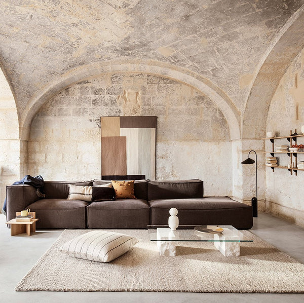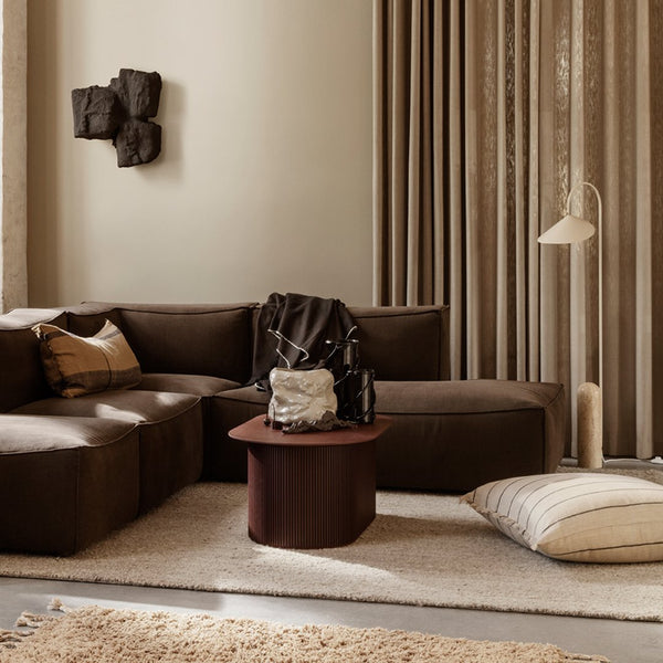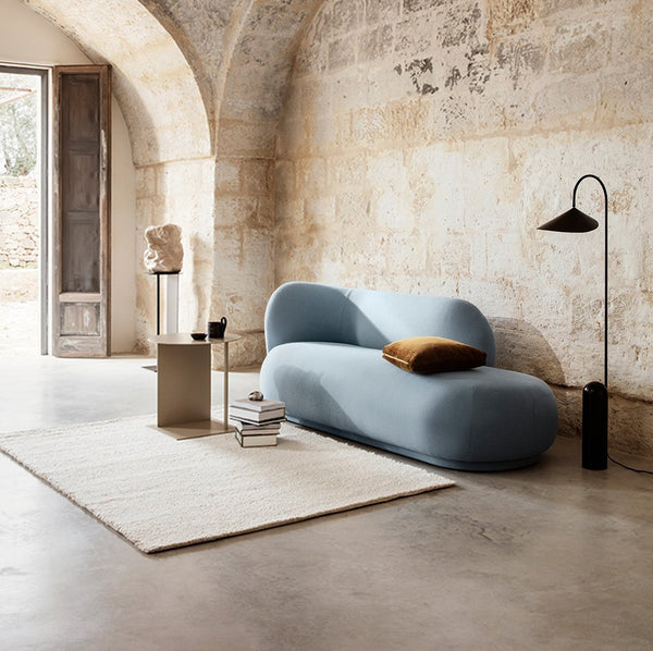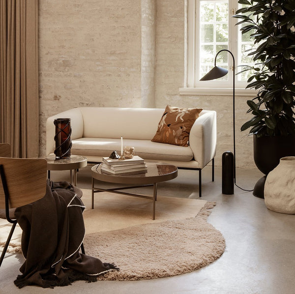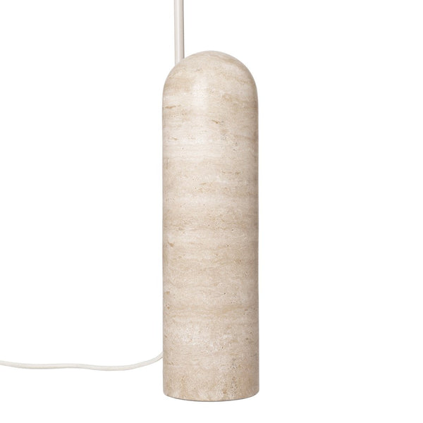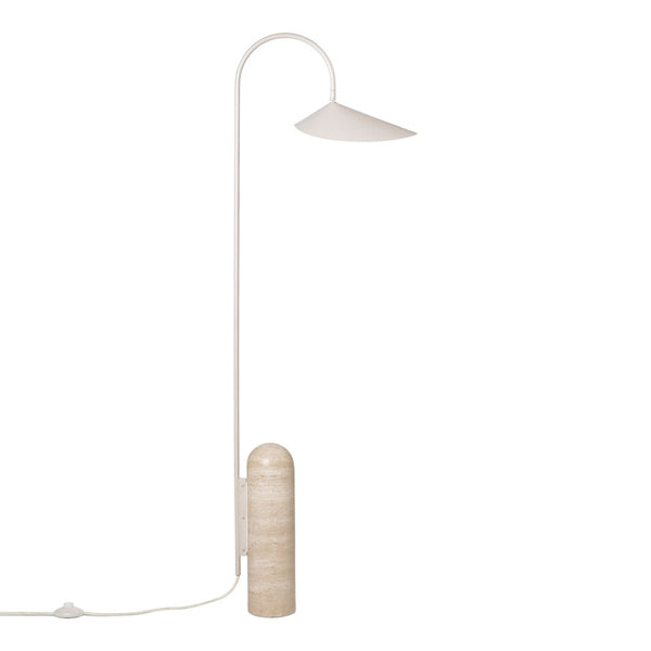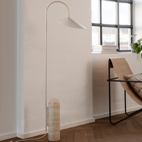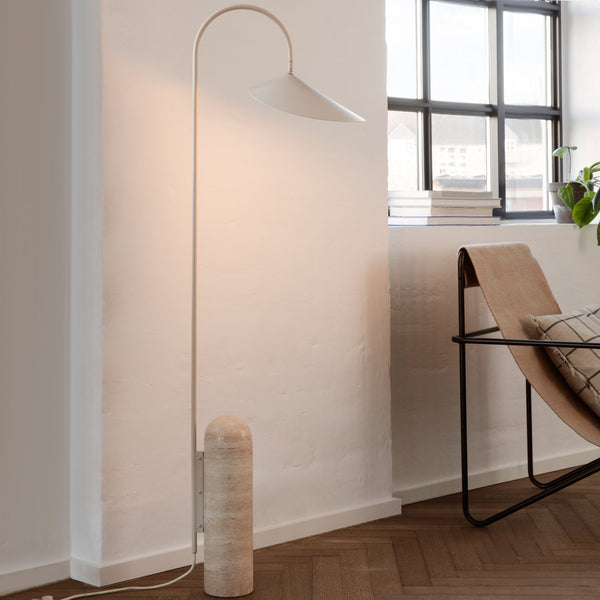 The Arum Floor Lamp is characterized by the black solid marble base combined with the organically shaped lampshade. Achieving the perfect balance in the off-centre structure of the lamp, the black marble foot counter-weighs the gentle way the lampshade is suspended from the curved metal arch in a leaf-like manner. With the matte, off-white inside of the shade, the lamp provides a soft, evenly distributed light, and the lampshade can be adjusted to ensure optimal light conditions in all situations.