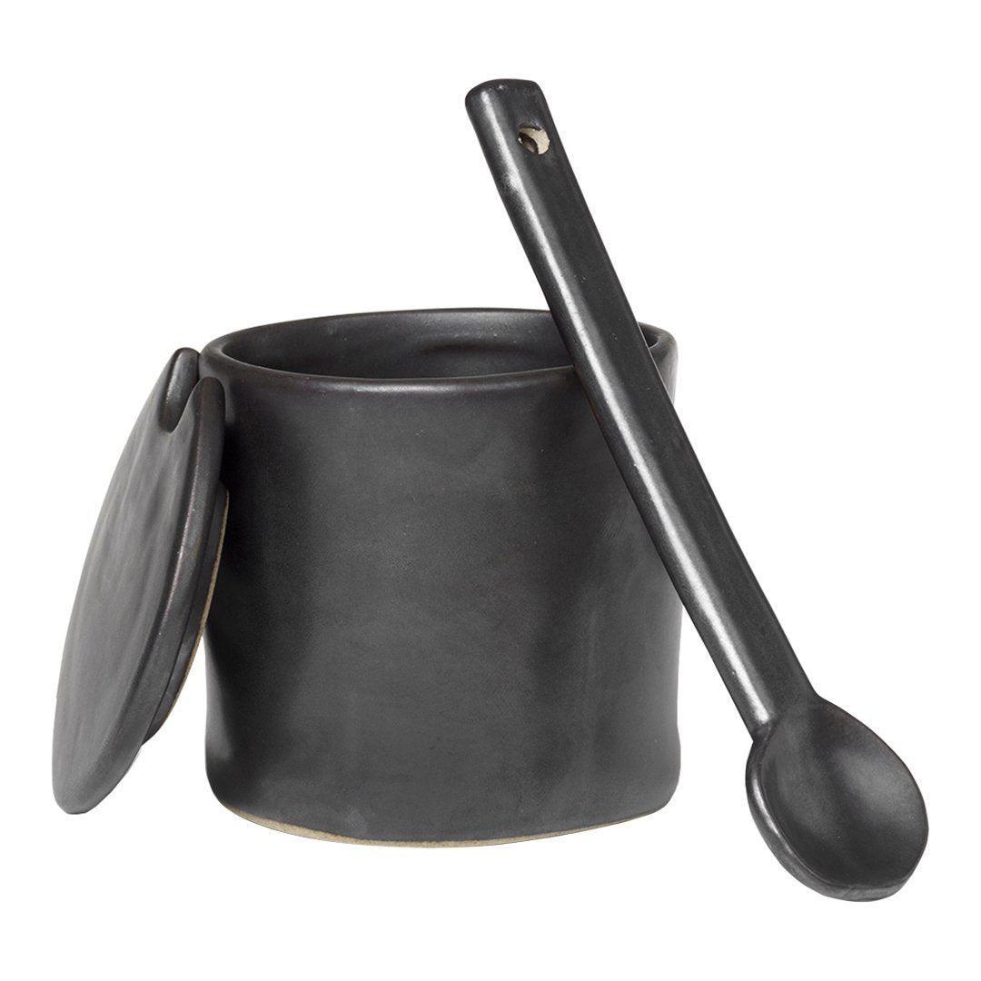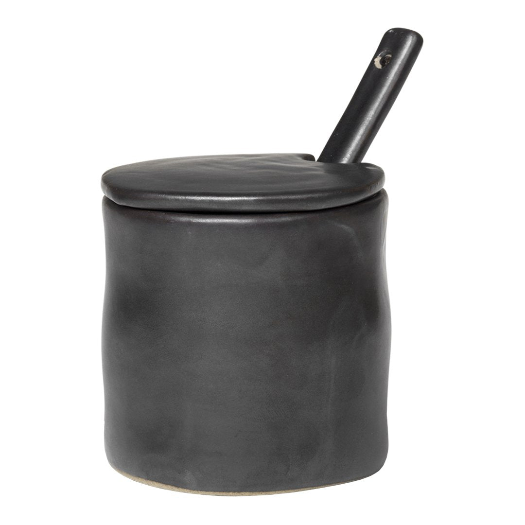 Flow is a series of perfectly imperfect tableware made to modern sensibilities using traditional craftsmanship techniques. All the items are detailed with a semi-matte glaze for a unique expression. Topped with a lid and complete with a serving spoon, this nostalgic yet modern jar works as well for jam as it does for sugar or salt.