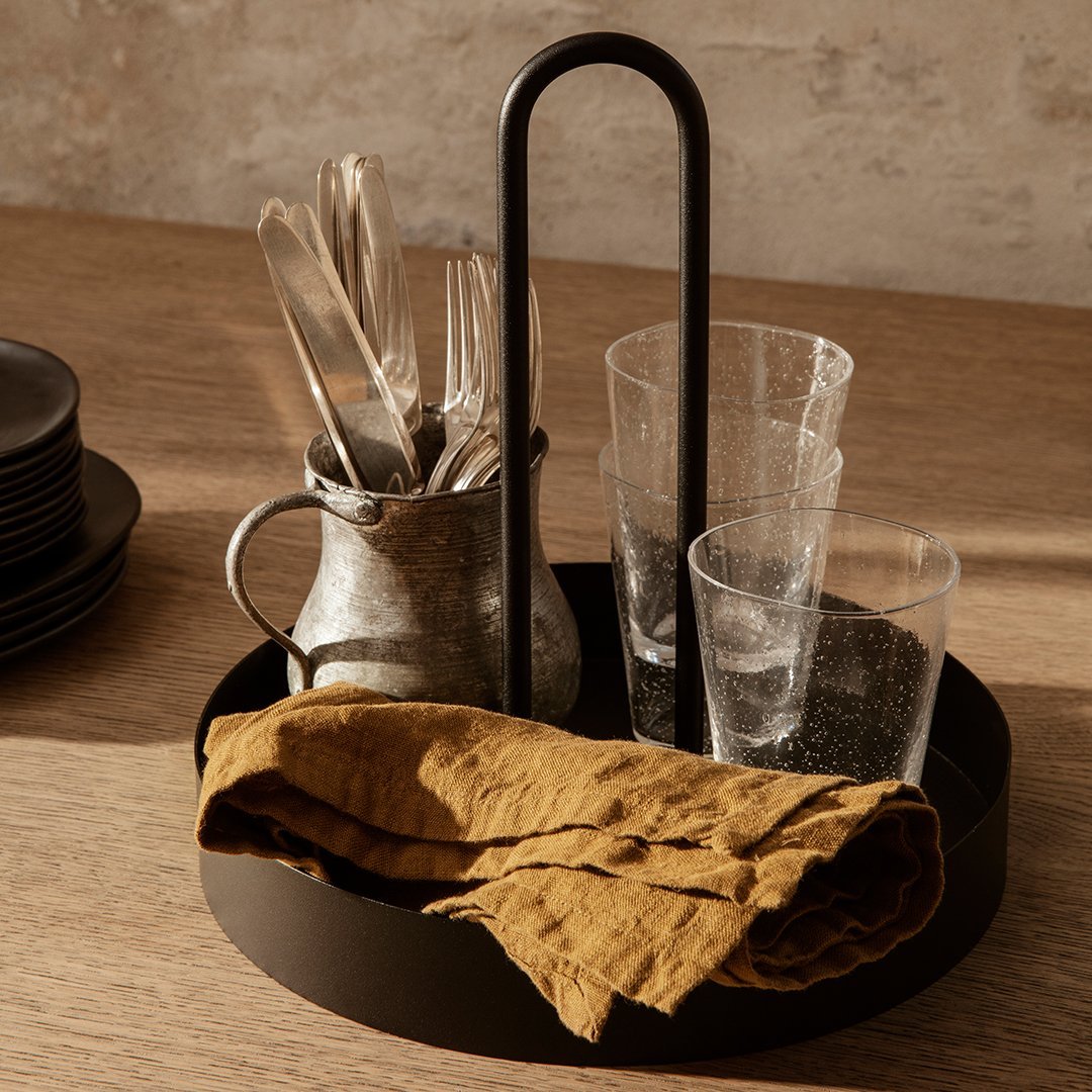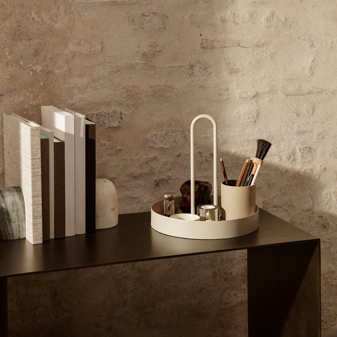 The Grib Tray is a handy solution for your various indoor-outdoor needs. Made from powder-coated metal, the spherical shape is mirrored in its rounded handle, which rests comfortably in your hand when carried. We call it a tray, but the versatile piece fits decoratively anywhere in your home – use it for spices and oils in the kitchen, to organize your office supplies or serve up a freshly made cocktail.