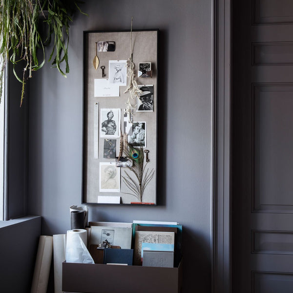 Stylishly organize your thoughts, inspirations and ideas with this pinboard series of a beautiful frame of black-stained ash wood with beige fabric on a cork base. These two components combined creates a raw and natural look, which is a nice fit in a modern home.