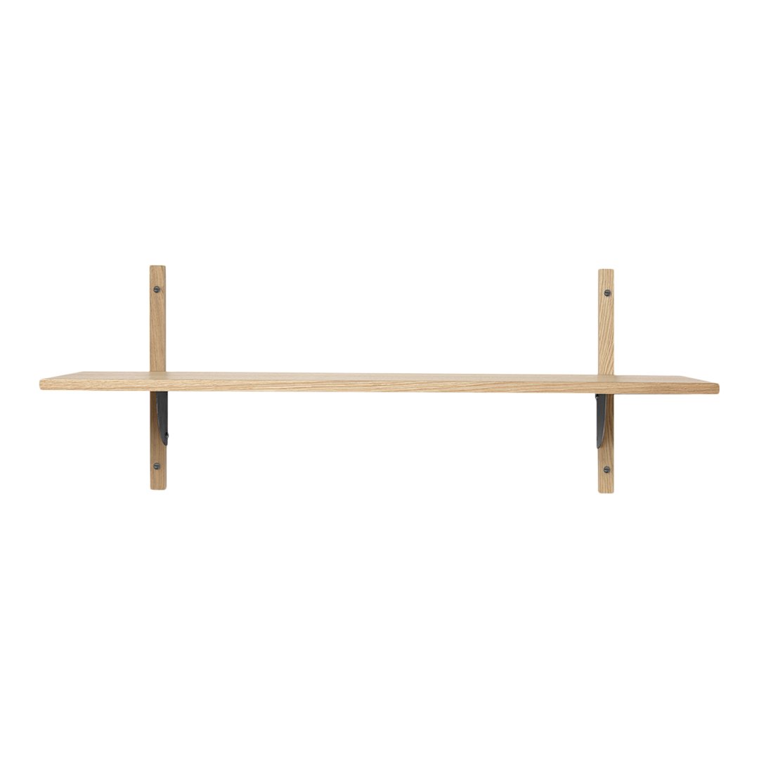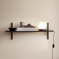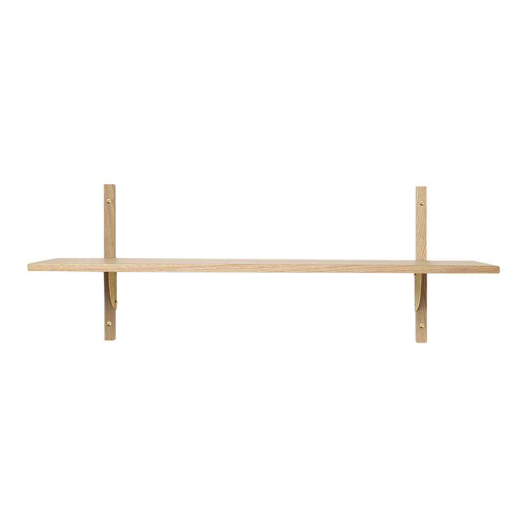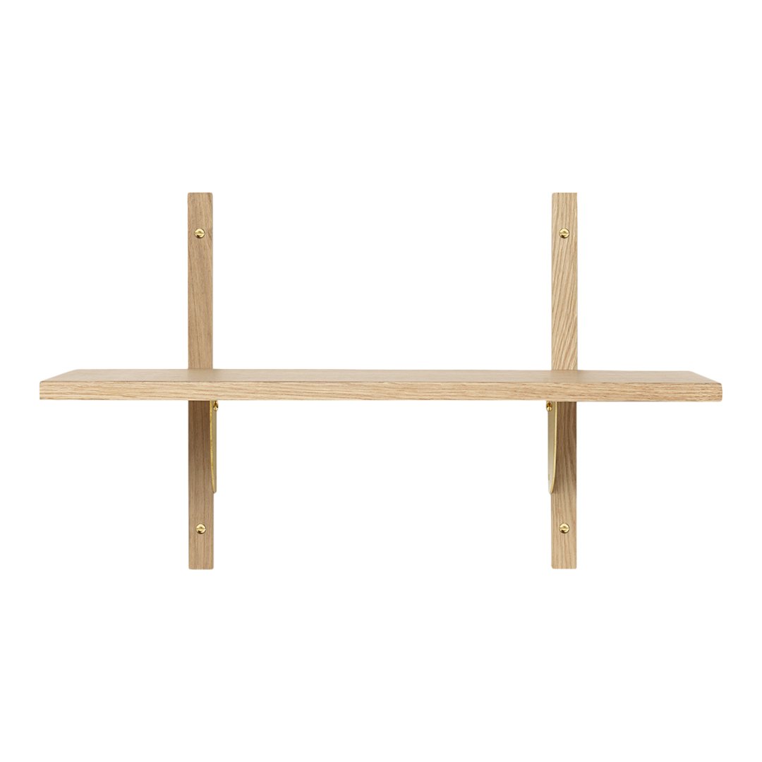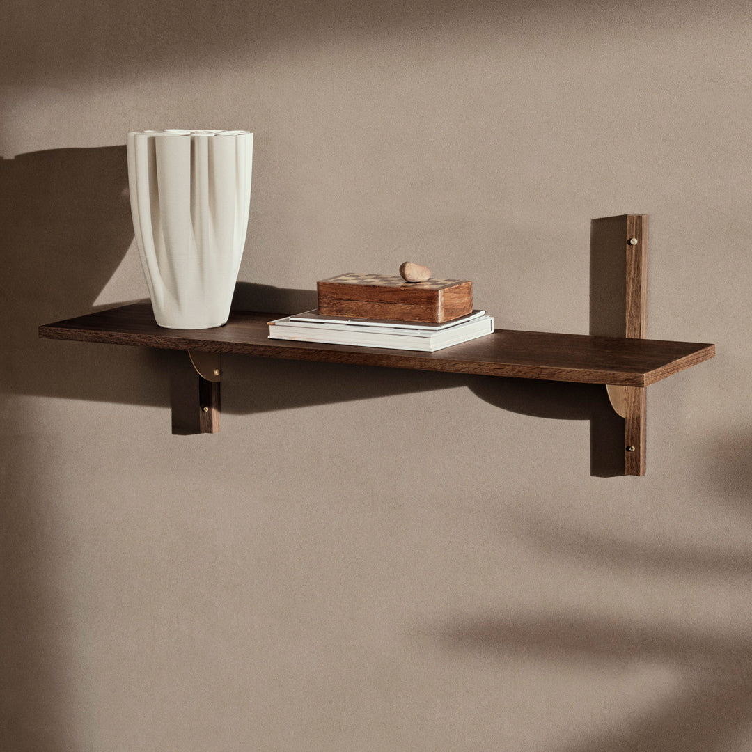 A new and modern take on Mid-century shelving units, Sector is defined by its sturdy simplicity and classic combination of wood and brass – available with natural oak veneer or black stained ash veneer shelves, and polished brass or blackened brass brackets. Available in two sizes, the shelf attaches to a wall with the accompanying solid wood uprights with visible screws. Use it to display favorite objects in a living room or storage jars in a kitchen.