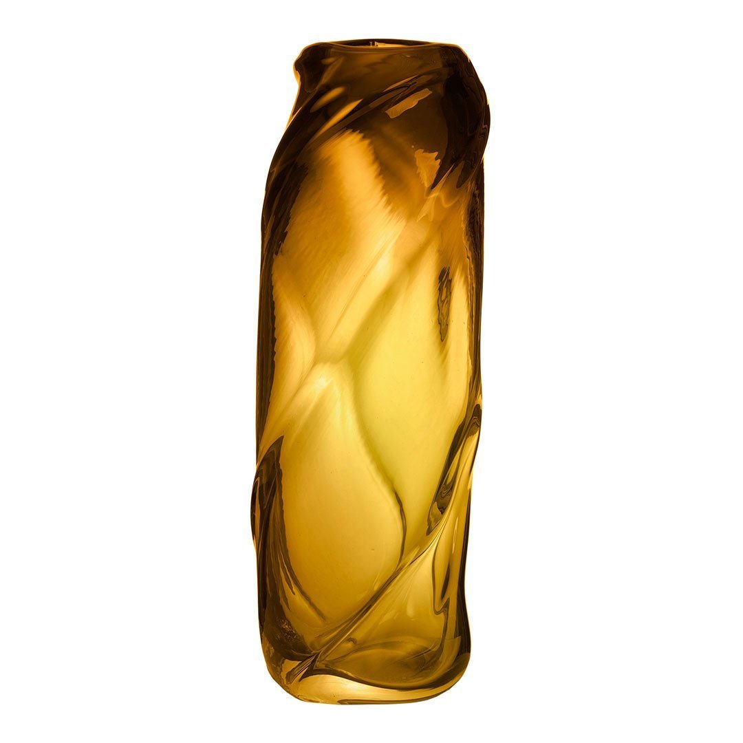 The mouth-blown and oversized Water Swirl Vase recalls a whirl of cascading liquid. With its translucent colored glass, the vase achieves a light and effortless, almost dancing, expression despite being crafted from solid, massive glass. Fill the vase with flowers or stalks, or style it solo and enjoy how the sun filters through the transparent glass. Enjoy the unique twists and curves of each individual piece, as no two vases are identical.