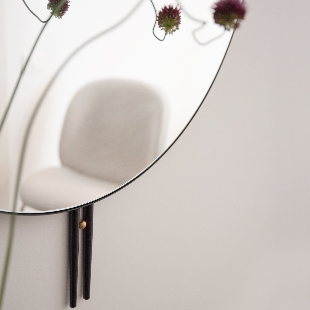 The brass sphere works as both a functional ‘spacer’ to strengthen the dual pipe-like mirror struts, and as an intimately considered signature detail or ‘pause’ that emphasizes both its own materiality and the careful attention paid to the spaces between the elements of each piece.