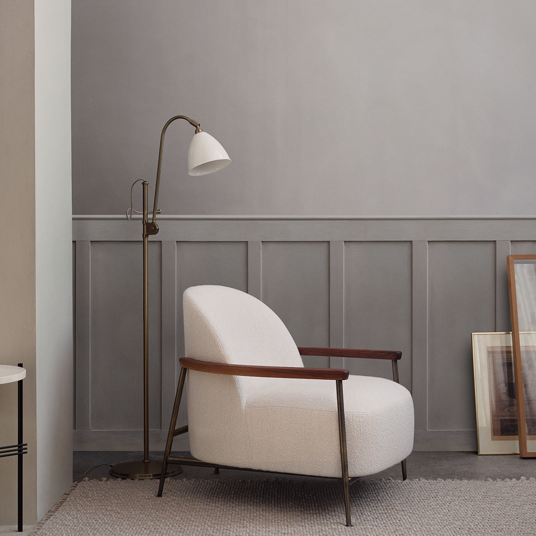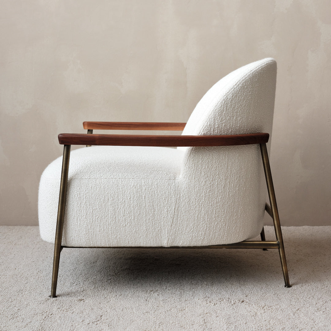 The Sejour Lounge Chair is a low-slung chair with playful proportions characterized by a deep, generous seat and a gently curving backrest set atop a slender metal frame and optional wooden armrests. This ingenious pairing of contrasting forms, weights and materials results in an intriguing, almost anthropomorphic form.