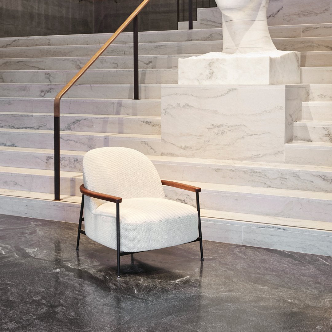 It makes a stylish statement in a bedroom – in fact it references early eighteenth-century ‘slipper’ chairs, once reserved for sitting on while donning shoes or slippers in elegant Victorian ladies’ boudoirs. The slipper typology started to appear in shared living spaces by the 1950s, and today, the Sejour Lounge Chair makes an elegant partner to the Epic Table and works well in arranged groups, but is even stronger in pairs or with a sofa, where there is a sense of the two pieces being deep in conversation. Its small size means it can be used in a variety of settings from homes to hotel and office lobbies, and its personality ensures it draws attention wherever it finds itself.
