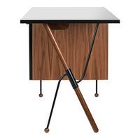 The 62 Series Desk features three drawers in walnut. Full gloss black top and doors with solid wood spheres on feet.