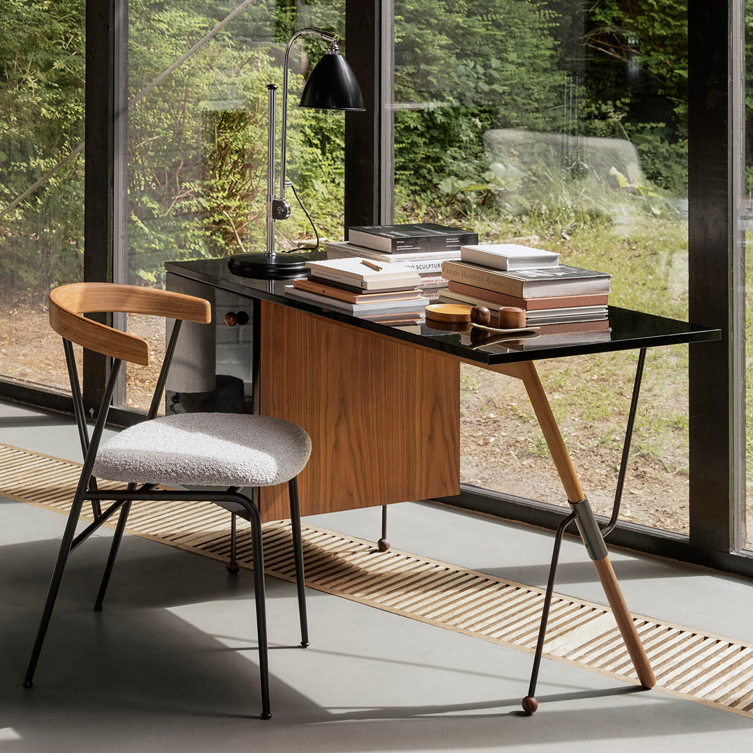 Designed in 1952, but named "the 62-series" because they were deemed to be ten years ahead of their time. The slender metal legs with the small solid wood spheres are a contrast to the sharp rectangular shapes, giving the furniture a characteristic appearance of lightness, the pieces almost seeming to defy gravity. It is made in American walnut, legs in powder-coated metal and a deep, black, full gloss finish on the top plates and doors. The "62-series" is made to order.