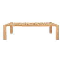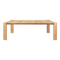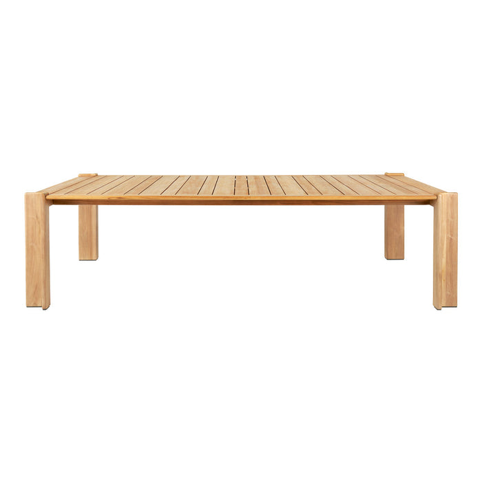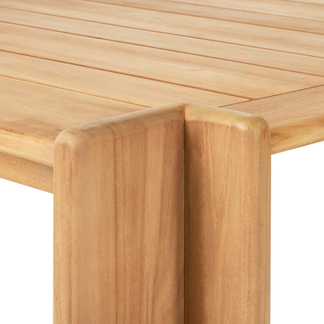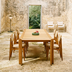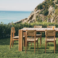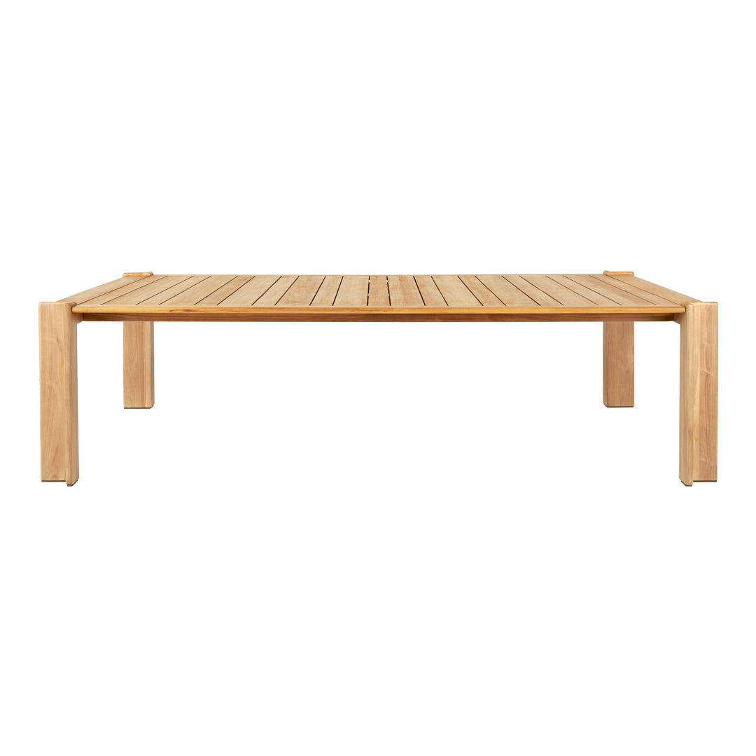 The simple aesthetics of the Atmosfera table maintains an understated poise with a nod to classic references without being too formal. The tabletops are made from rhythmic, repeating slats of solid, premium teak, enclosed by a frame made from the same slats, giving a minimalist feel. The table legs are formed from two vertical slats, using a miter joint that creates an inverted ‘L-shape’ on each corner. Referencing architectural and maritime design, the unusual leg design provides both structural support and visual interest, giving the piece a certain lightness. Each leg protrudes slightly above the tabletop surface, culminating in a rounded detail in contrast to the geometric lines of the structure, that gives a calm composure to the design.
