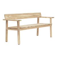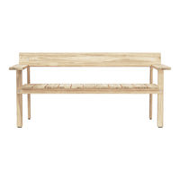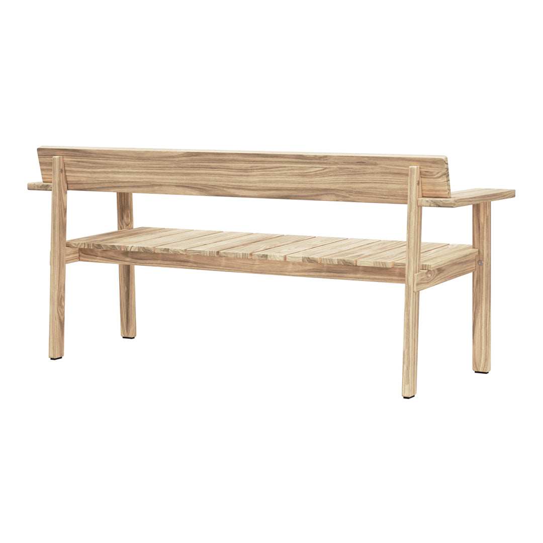 An outdoor bench with generous proportions, it features a gently sloping backrest and wide armrests that become useful side tables on which to rest a cup or small plate. Offering a place for quiet contemplation or conversation, the bench is suitable for versatile outdoor settings. A slim, weather-resistant seat cushion is also available for additional comfort.