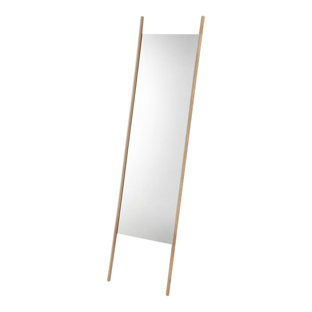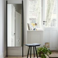 Chris L. Halstrom's two versions of the Georg Mirror have the same functional features. The extra-length poles that frame the mirror also act as supports when the mirror, small or large, leans against the wall. The extra-length poles also offer a place to hang personal belongings.